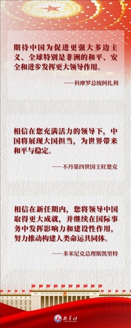 多國(guó)領(lǐng)導(dǎo)人在賀電賀函中表達(dá)他們對(duì)習(xí)近平全票當(dāng)選的祝賀與敬佩之情。