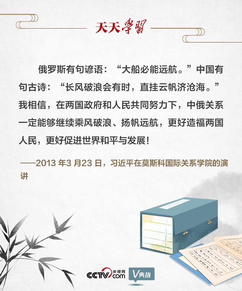 關(guān)于中俄關(guān)系,早在10年前在莫斯科國際關(guān)系學(xué)院的演講中,習(xí)近平主席就有精辟闡述。演講結(jié)束語中,習(xí)主席首先引用一句俄羅斯諺語“大船必能遠(yuǎn)航”,拉近了與俄羅斯民眾的文化空間和心理距離。接著引用了含義相近的中國古詩“長風(fēng)破浪會有時(shí),直掛云帆濟(jì)滄?!保寣Ψ皆谖幕嗨菩灾猩羁填I(lǐng)悟其中道理。最后凝聚共同理念:“中俄關(guān)系一定能夠繼續(xù)乘風(fēng)破浪、揚(yáng)帆遠(yuǎn)航”。