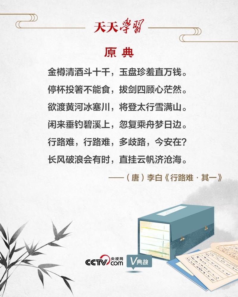 “行路難”為樂府古題,多詠嘆世路艱難及貧困孤苦的處境。李白的《行路難》共三首,“長風(fēng)破浪會有時(shí)”出自第一首。唐天寶元年(742年),李白奉詔入京,擔(dān)任翰林供奉。后因權(quán)臣讒毀排擠,被“賜金放還”?!缎新冯y》便是李白離開長安時(shí)所作。