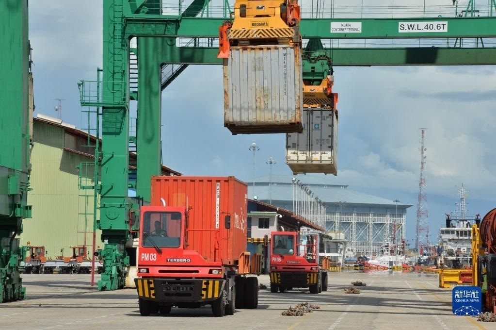 這是2022年1月1日拍攝的正在進行集裝箱裝卸作業(yè)的文萊摩拉港碼頭。文萊摩拉港由中國和文萊合資企業(yè)——摩拉港有限公司運營。2022年1月1日,區(qū)域全面經(jīng)濟伙伴關(guān)系協(xié)定(RCEP)生效實施。新華社發(fā)(杰弗里·黃攝)