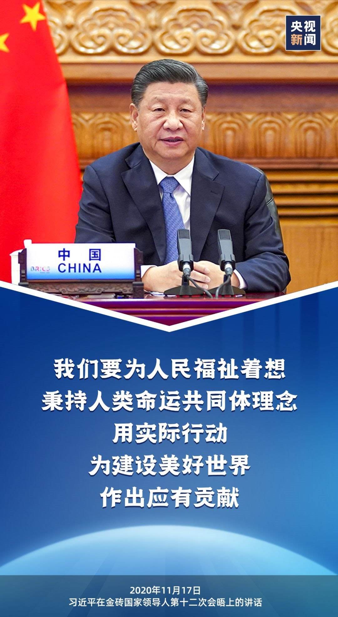 2020年11月17日,國家主席習(xí)近平出席金磚國家領(lǐng)導(dǎo)人第十二次會晤并發(fā)表重要講話時指出,“我們要為人民福祉著想,秉持人類命運共同體理念,用實際行動為建設(shè)美好世界作出應(yīng)有貢獻?!?/p>