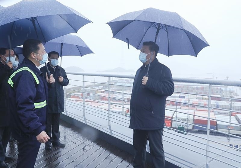 △2020年3月29日,習(xí)近平總書記在浙江寧波舟山港考察調(diào)研。考察返京不足10天,總書記在中央財(cái)經(jīng)委員會(huì)第七次會(huì)議上,首次提出構(gòu)建新發(fā)展格局。