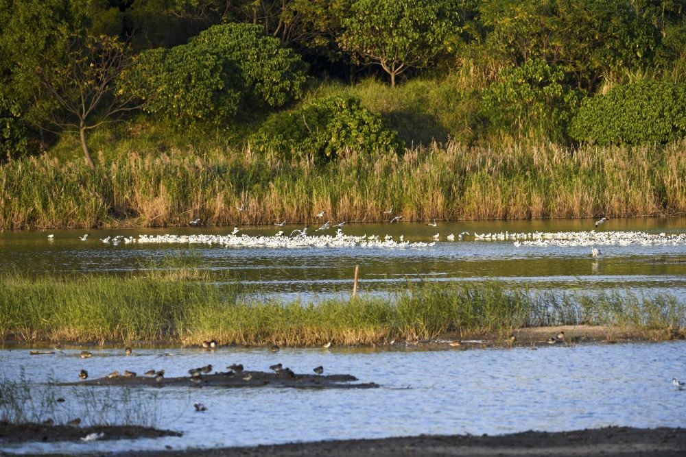 ↑鷺鳥在海南儋州市新英鹽場(chǎng)濕地人工栽種的紅樹林間覓食(2022年11月8日攝)。