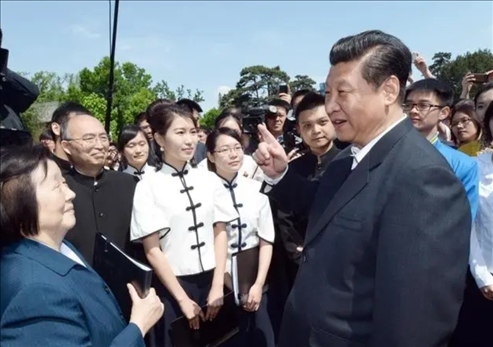 △2014年5月4日,習近平總書記在北京大學校園觀看北大師生紀念五四運動95周年青春詩會時同朗誦者親切交談。