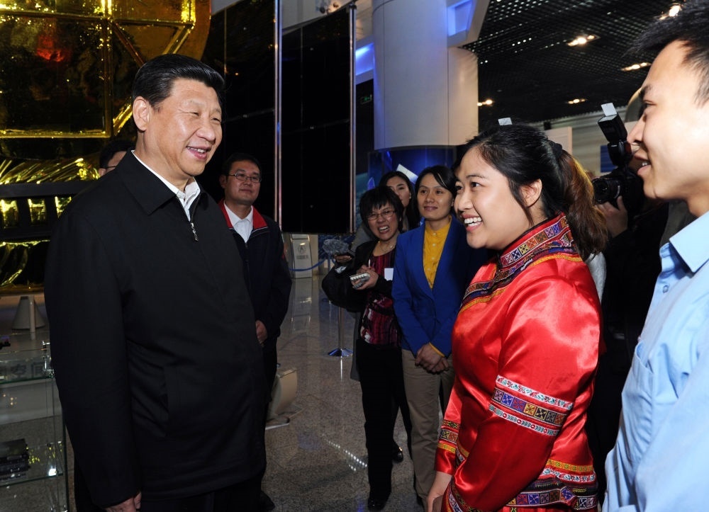 2013年5月4日,習近平來到中國航天科技集團公司中國空間技術研究院,同各界優(yōu)秀青年代表座談并發(fā)表重要講話。這是座談會前,習近平和在展廳參觀的優(yōu)秀青年代表交談。