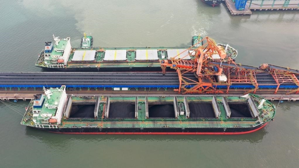 5月11日,船舶??吭邳S驊港煤炭港區(qū)碼頭(無人機(jī)照片)。新華社記者 駱學(xué)峰 攝