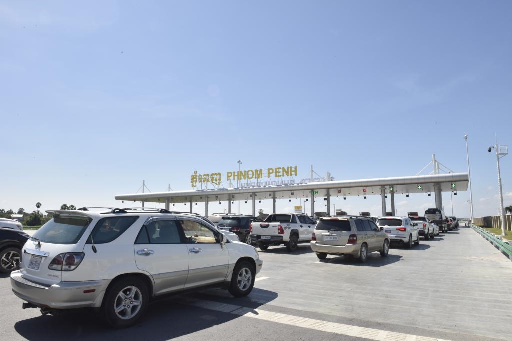 2022年11月7日,車輛在柬埔寨首都金邊的金港高速公路入口處排隊(duì)。金港高速公路連接柬埔寨首都金邊和該國最大深水海港西哈努克港。