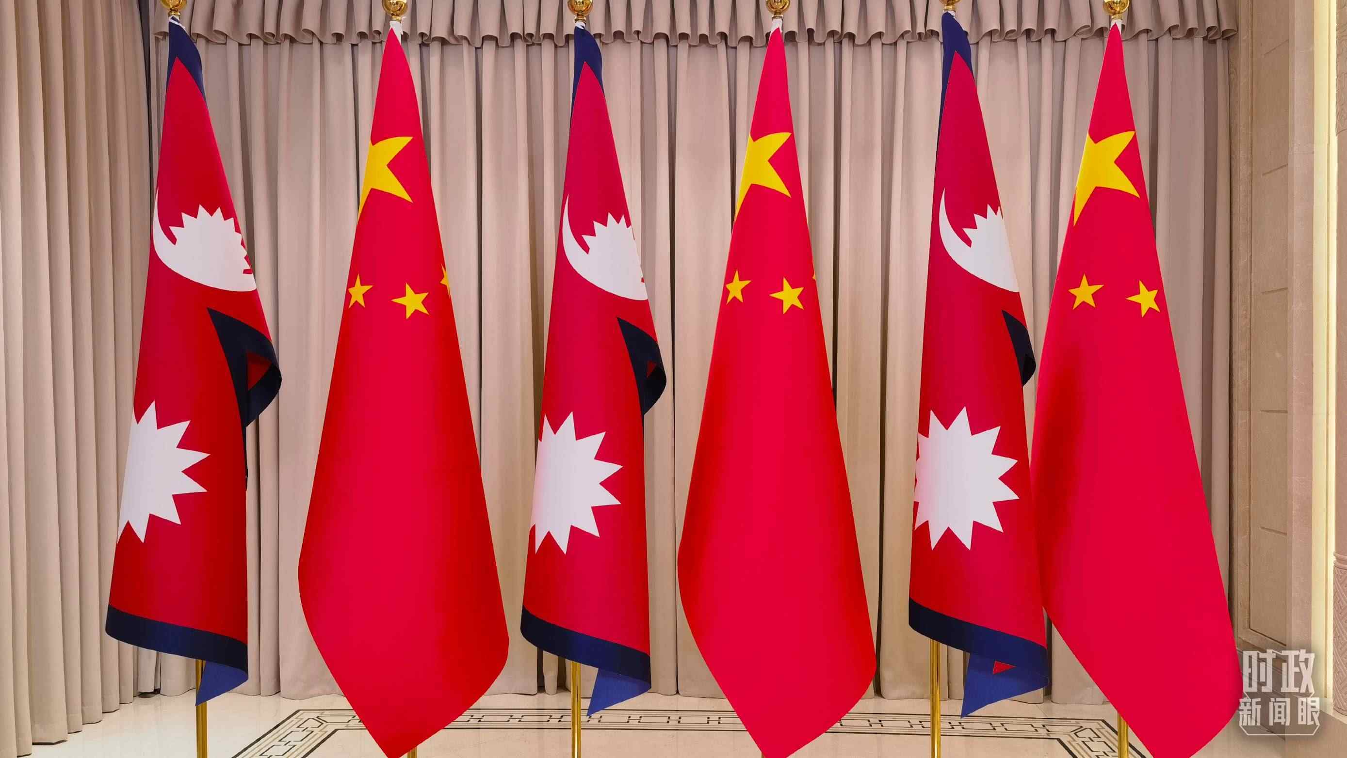 △會(huì)見現(xiàn)場(chǎng)擺放的中國(guó)、尼泊爾國(guó)旗。(總臺(tái)央視記者周志國(guó)拍攝)