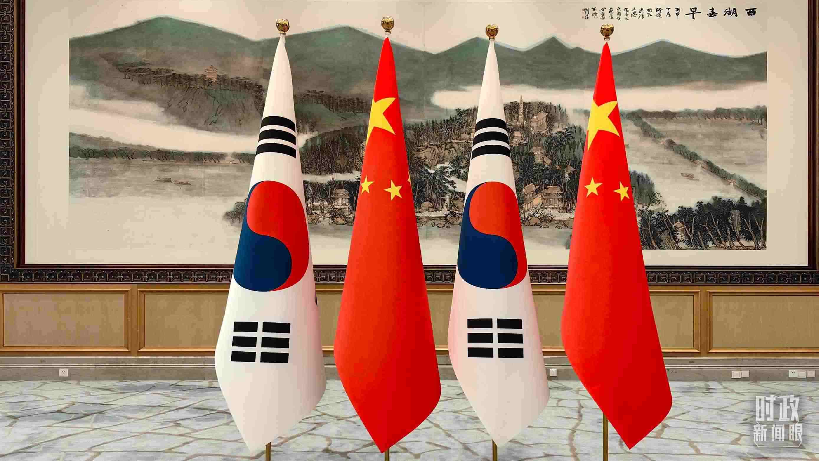 △會(huì)見現(xiàn)場(chǎng)擺放的中國(guó)、韓國(guó)國(guó)旗。(總臺(tái)央廣記者潘毅拍攝)