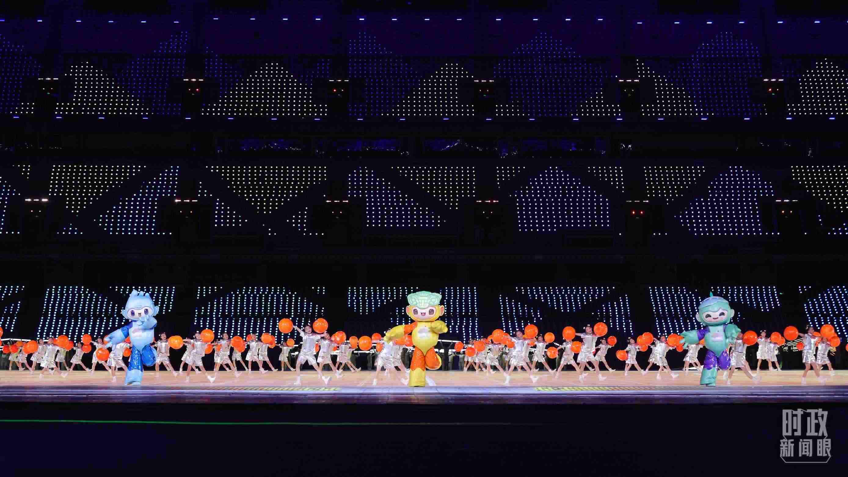 △開幕式文藝表演中的亞運(yùn)會(huì)吉祥物。(總臺(tái)央視記者魏幫軍拍攝)