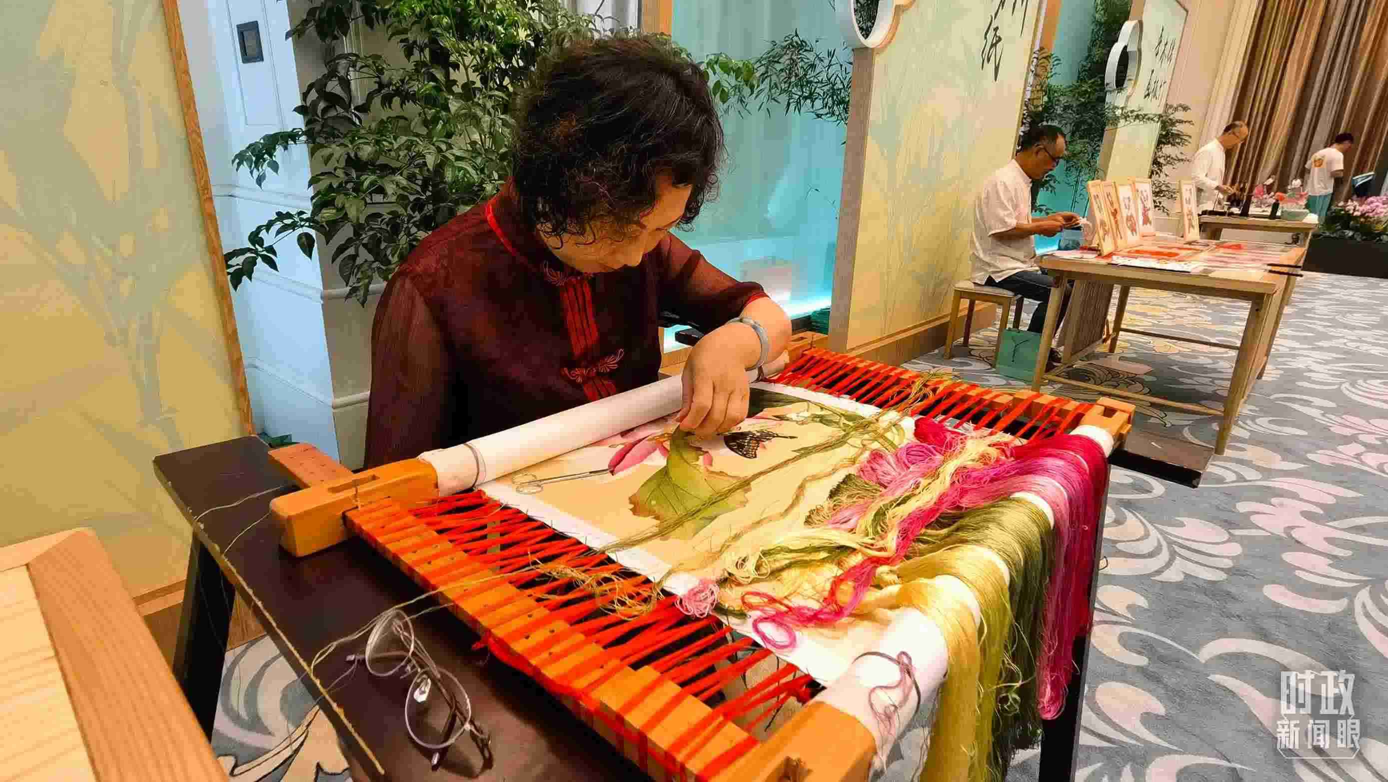 △為國(guó)際貴賓展示的四川非物質(zhì)文化遺產(chǎn)棕編和蜀繡。(總臺(tái)央視記者蔣碩、韓銳拍攝)