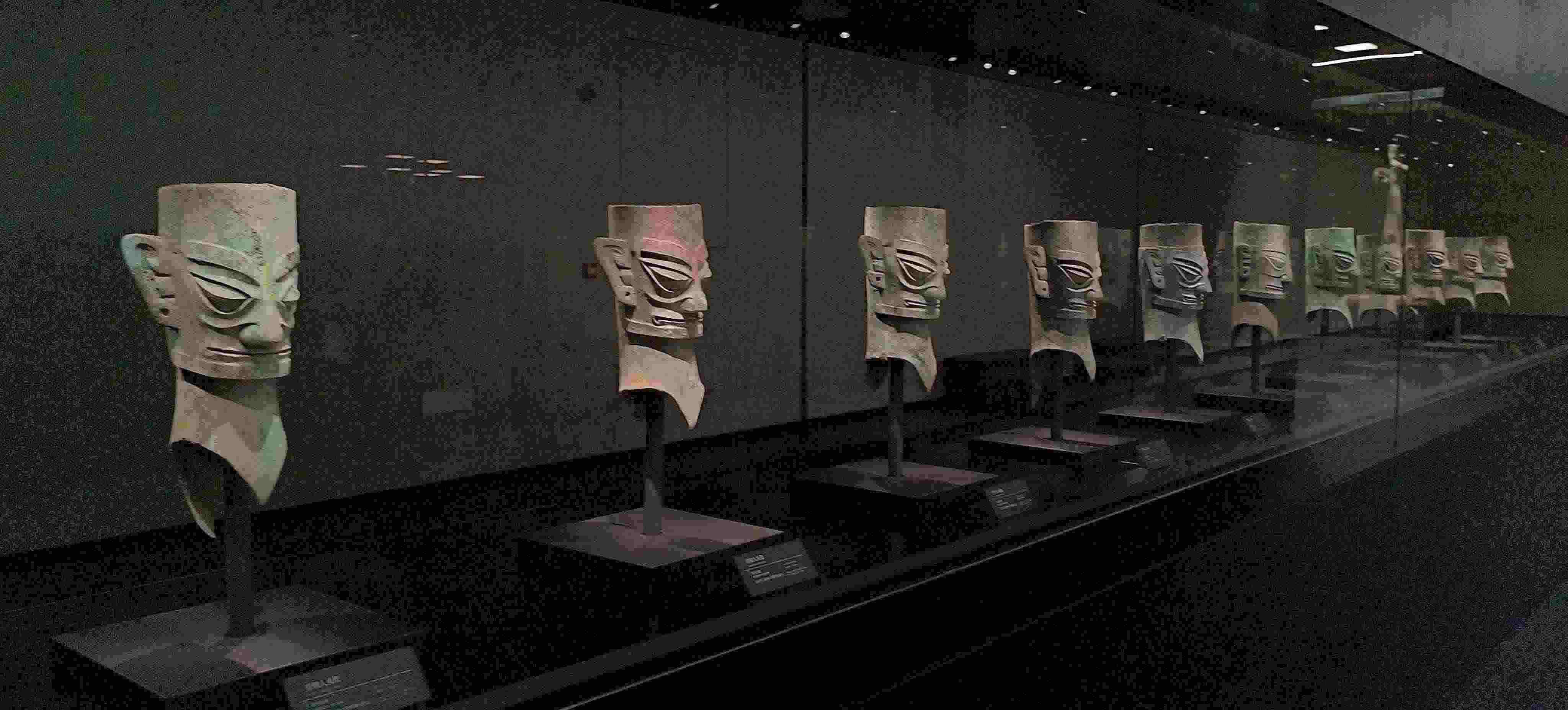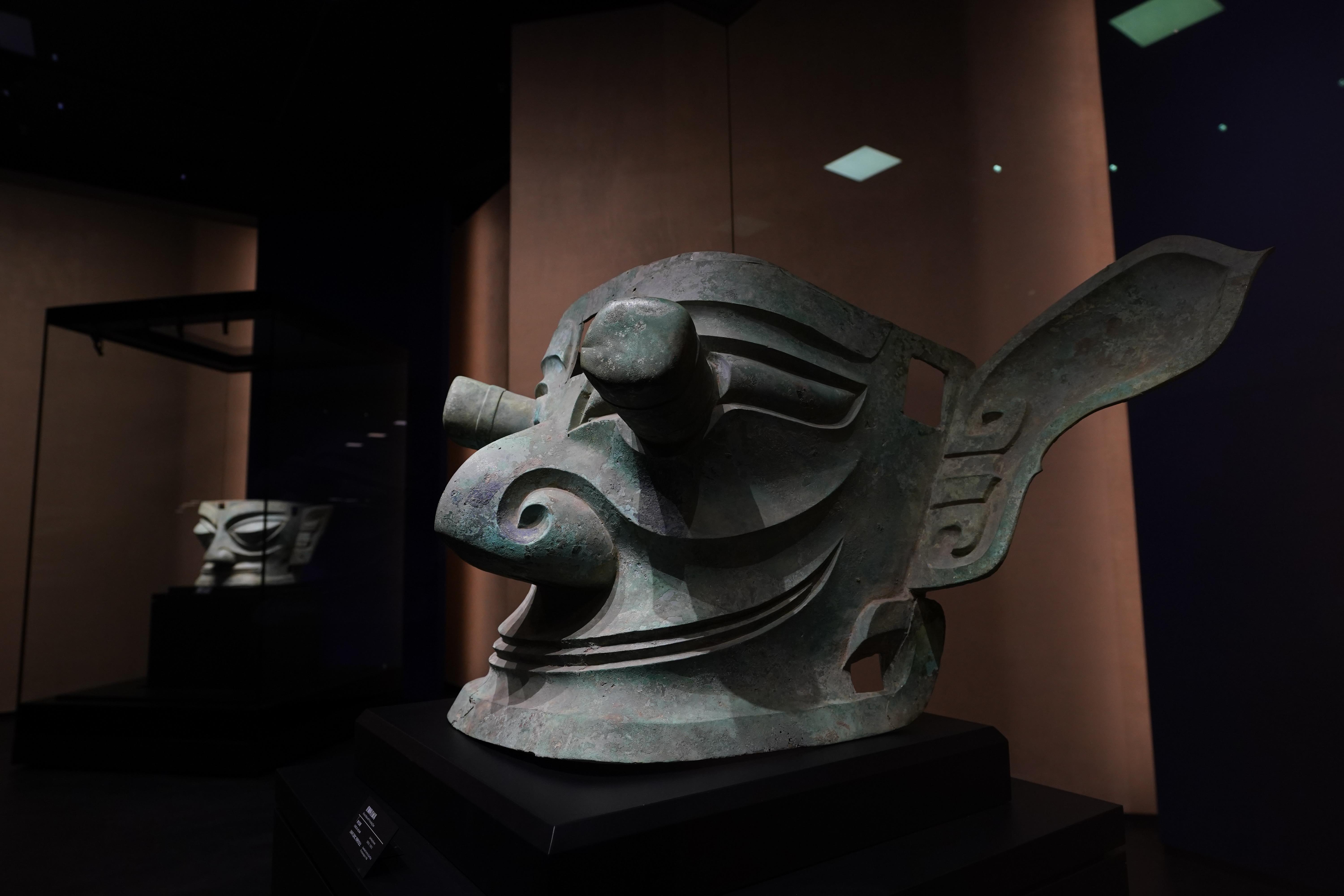 △三星堆博物館展出的青銅人頭像。(總臺(tái)央視記者范凱拍攝)