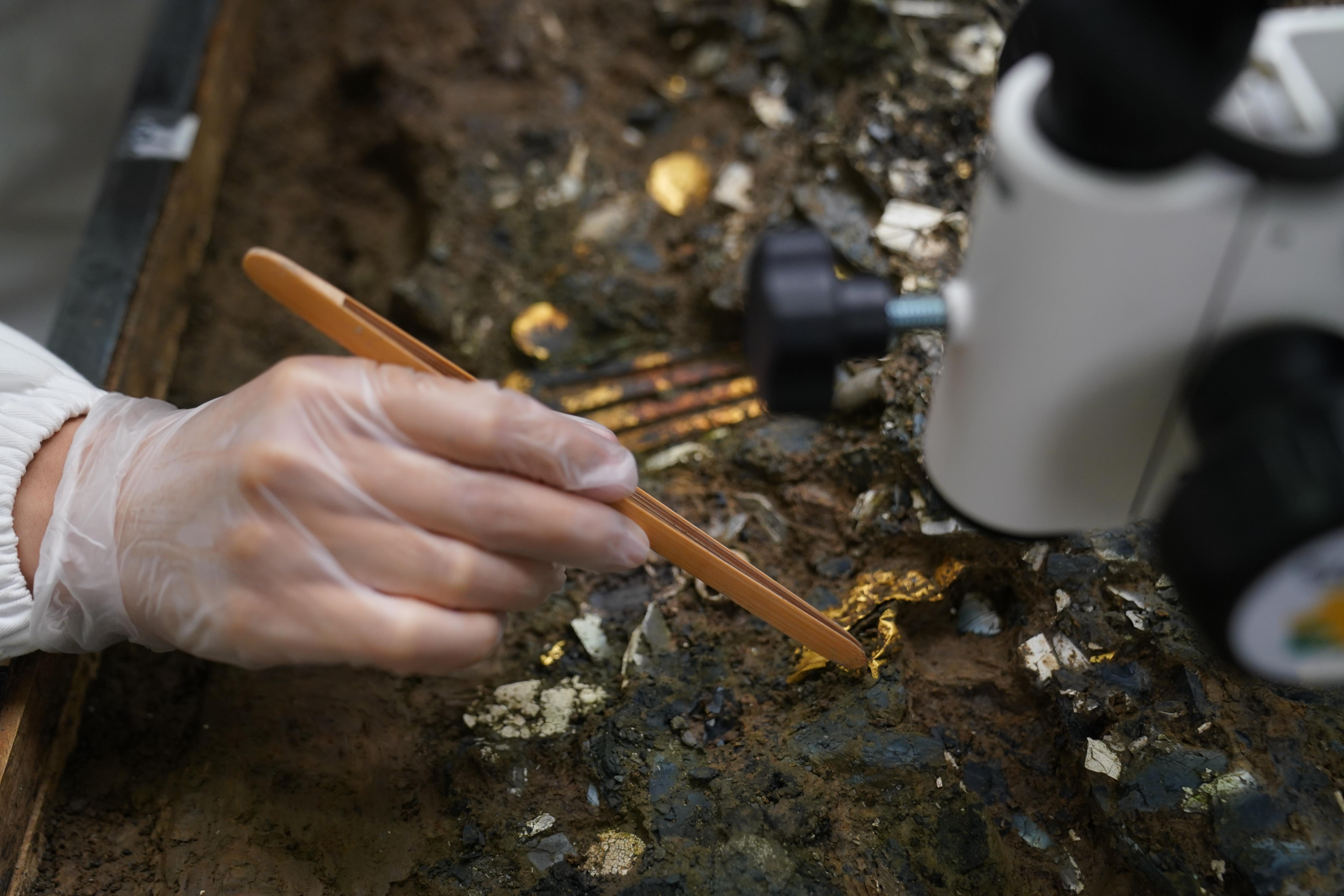 △三星堆博物館文物保護(hù)修復(fù)館內(nèi),三星堆文物修復(fù)人員正在對(duì)出土文物進(jìn)行清理。(總臺(tái)國(guó)廣記者李晉拍攝)