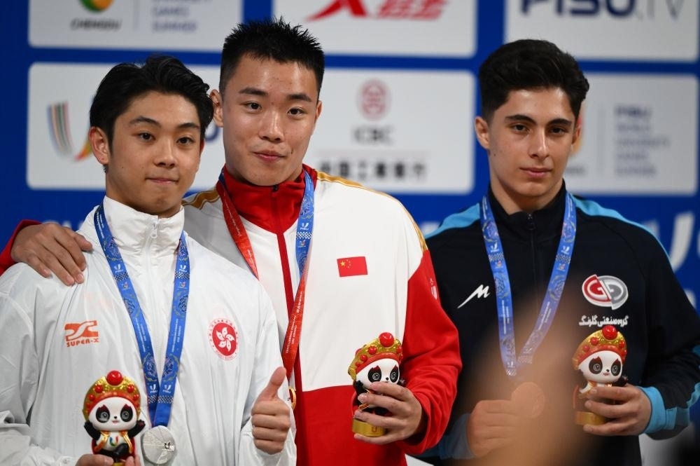 △2023年7月29日,成都大運(yùn)會武術(shù)項(xiàng)目男子南拳冠軍中國隊(duì)選手曹茂園(中)、亞軍中國香港隊(duì)選手劉子龍(左)和季軍伊朗隊(duì)選手巴尼塔勒比在頒獎儀式上。