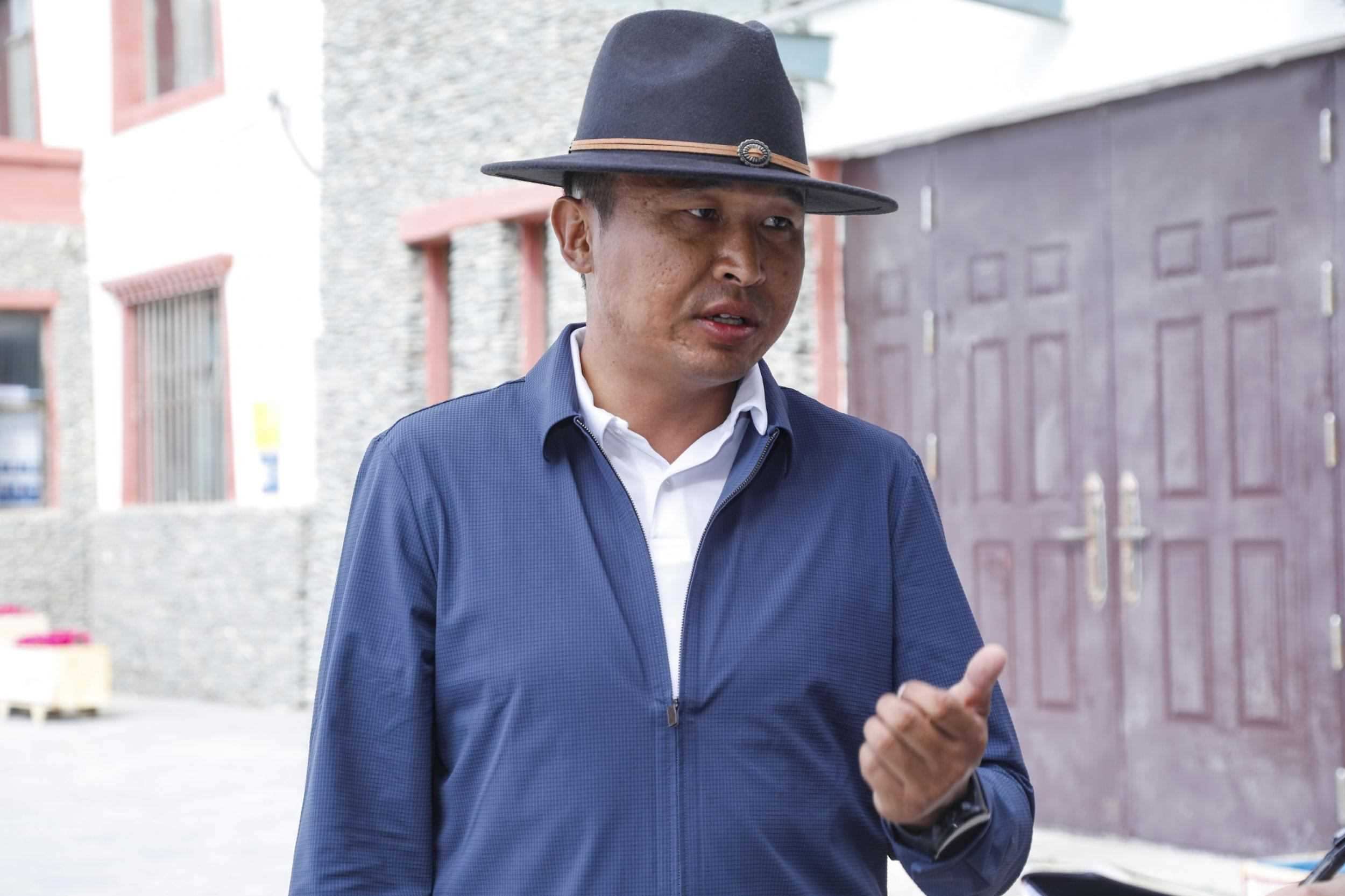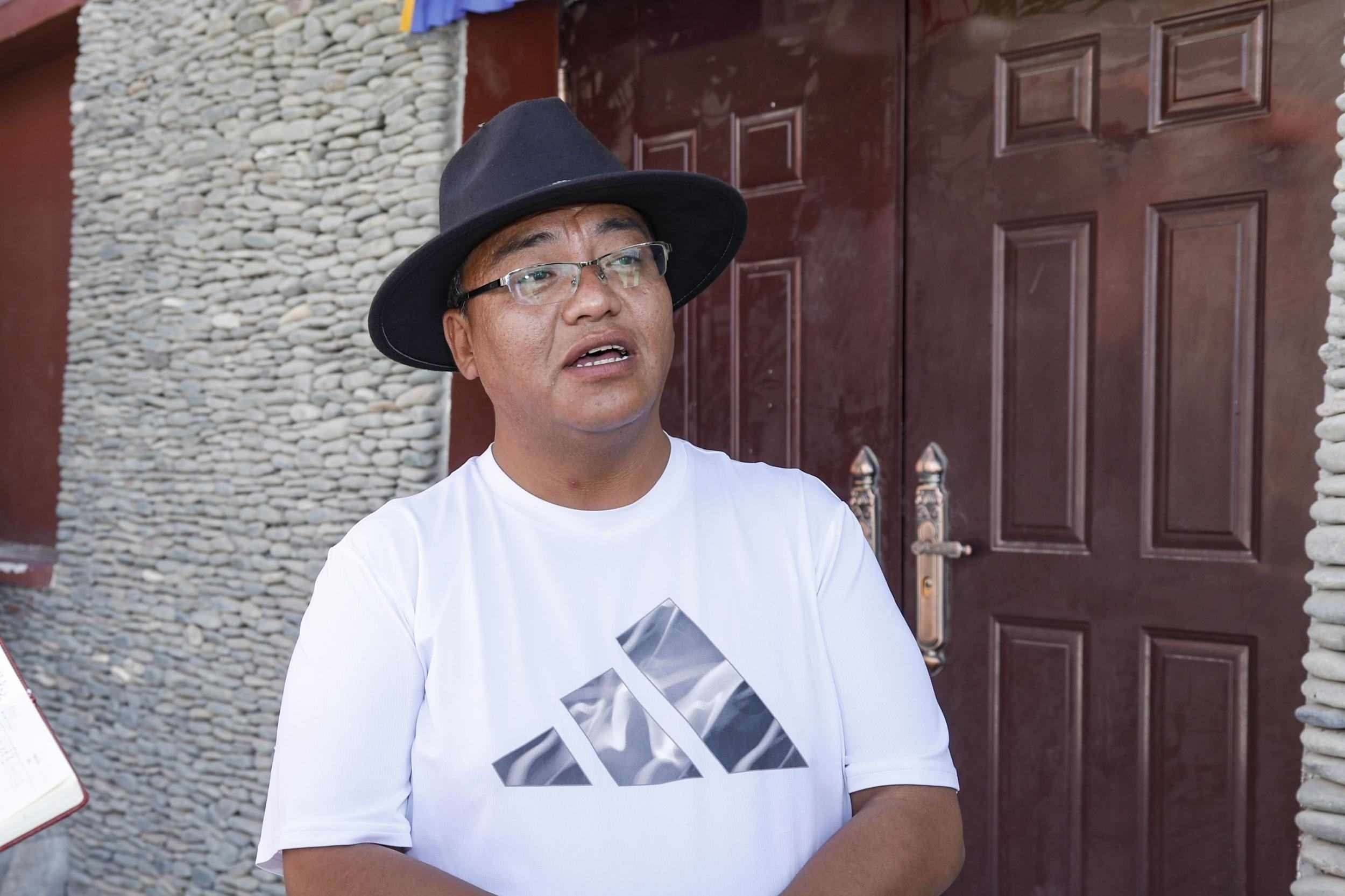 2023年7月22日,在長江源村文化廣場(chǎng)前,唐古拉山鎮(zhèn)黨委書記索南東主分享他參與長江生態(tài)保護(hù)的心得。王箏 攝