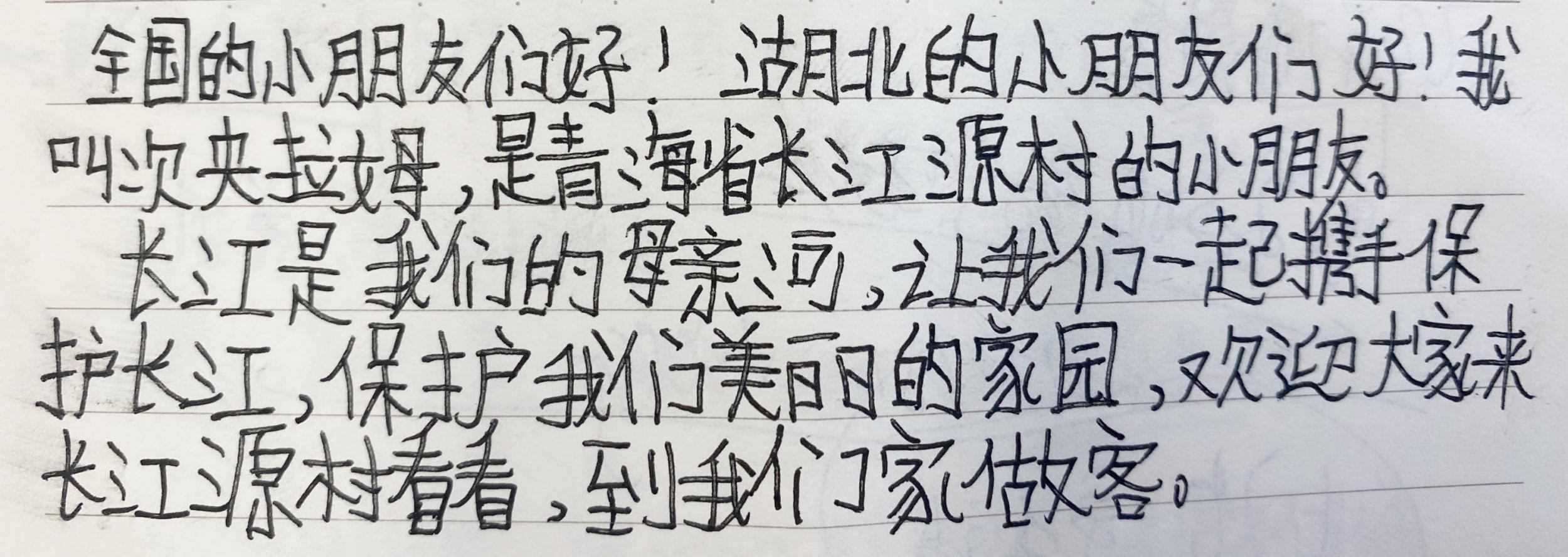 “全國的小朋友們好!湖北的小朋友們好!我叫次央拉姆,是青海省長江源村的小朋友。長江是我們的母親河,讓我們一起攜手保護(hù)長江,保護(hù)我們美麗的家園!歡迎大家來長江源看看,到我們家做客!”