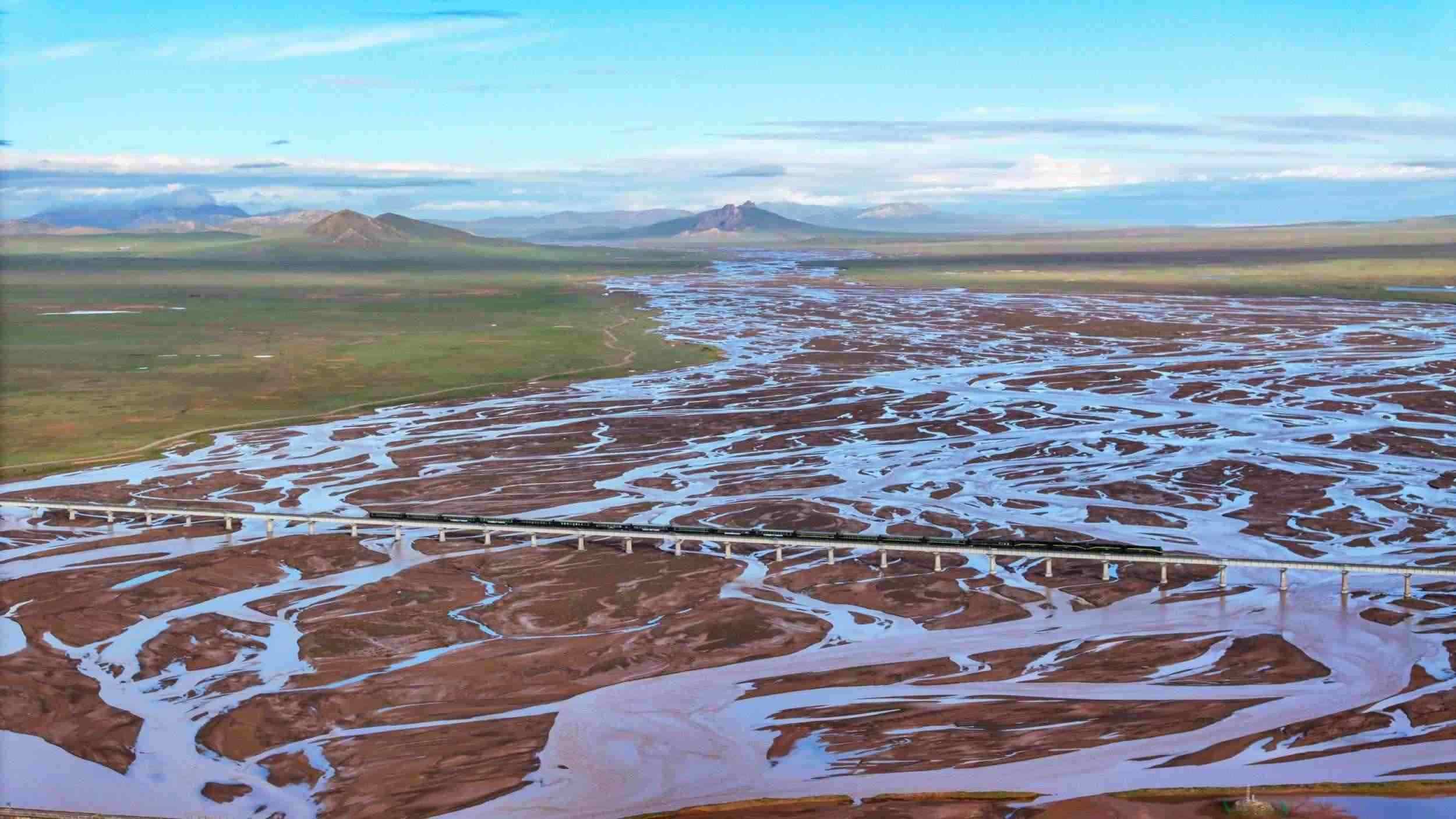 長江源特大橋全長1389.6米,是萬里長江源頭上的第一座鐵路橋,連通“天路”青藏鐵路。站在“長江源”石碑前眺望,大橋氣勢(shì)雄壯,如長虹飛跨沱沱河,橋上不時(shí)有火車疾馳而過。