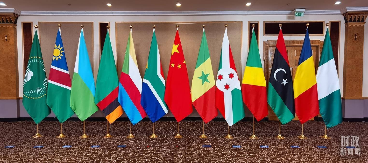 △中非領(lǐng)導(dǎo)人對(duì)話會(huì)會(huì)場(chǎng)擺放的與會(huì)各方旗幟。(總臺(tái)央視記者郭鴻拍攝)