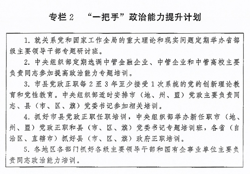 (二)突出“關(guān)鍵少數(shù)”政治訓(xùn)練。堅(jiān)持把政治訓(xùn)練貫穿干部成長全周期,使干部的政治素養(yǎng)、政治能力與擔(dān)負(fù)的領(lǐng)導(dǎo)職責(zé)相匹配。強(qiáng)化“一把手”政治培訓(xùn),有計劃地選調(diào)地方、部門、國有企事業(yè)單位主要負(fù)責(zé)同志到黨校(行政學(xué)院)、干部學(xué)院參加專題培訓(xùn)。實(shí)施“一把手”政治能力提升計劃(專欄2)。?。ㄗ灾螀^(qū)、直轄市)、市(地、州、盟)、縣(市、區(qū)、旗)黨政領(lǐng)導(dǎo)班子成員每2至3年到黨校(行政學(xué)院)、干部學(xué)院至少接受1次系統(tǒng)的黨的創(chuàng)新理論教育和黨性教育,5年內(nèi)累計不少于2個月。圍繞提高政治能力和領(lǐng)導(dǎo)能力,加強(qiáng)機(jī)關(guān)司局長、處長任職培訓(xùn)。重視對女干部、少數(shù)民族干部、黨外干部等的政治培訓(xùn)。加強(qiáng)對高層次人才的政治引領(lǐng),中央組織部會同有關(guān)單位每年組織一定數(shù)量人才開展國情研修。