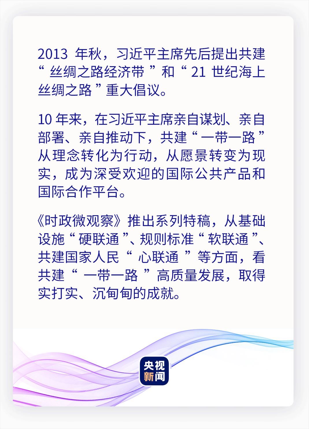 10年來,共建“一帶一路”以高標(biāo)準(zhǔn)、可持續(xù)、惠民生為目標(biāo),以規(guī)則標(biāo)準(zhǔn)“軟聯(lián)通”為重要支撐,為促進(jìn)全球互聯(lián)互通、共同發(fā)展增添新動(dòng)力,推動(dòng)高質(zhì)量共建“一帶一路”不斷走深走實(shí)。