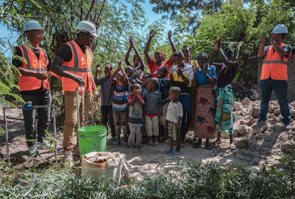 6月13日,在坦桑尼亞姆萬(wàn)扎省米松圭,凱爾文(左二)與同事接通水管后贏得當(dāng)?shù)鼐用窆恼茪g呼。新華社記者 王冠森 攝