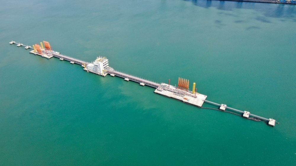 這是肯尼亞蒙巴薩油碼頭(2023年9月20日攝,無人機照片)。新華社發(fā)(中國交通建設股份有限公司肯尼亞蒙巴薩新建油碼頭項目部供圖)
