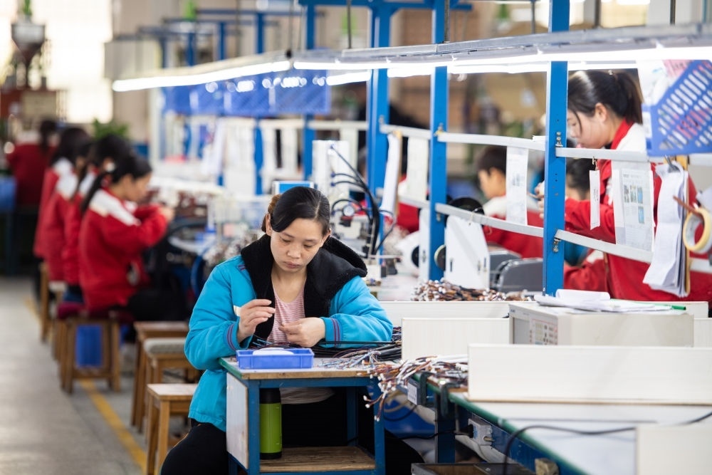 在湖南省汨羅市神鼎山鎮(zhèn)豐倉(cāng)村的“巾幗車間”,工人在生產(chǎn)數(shù)據(jù)線(2023年3月7日攝)。新華社記者 陳思汗 攝