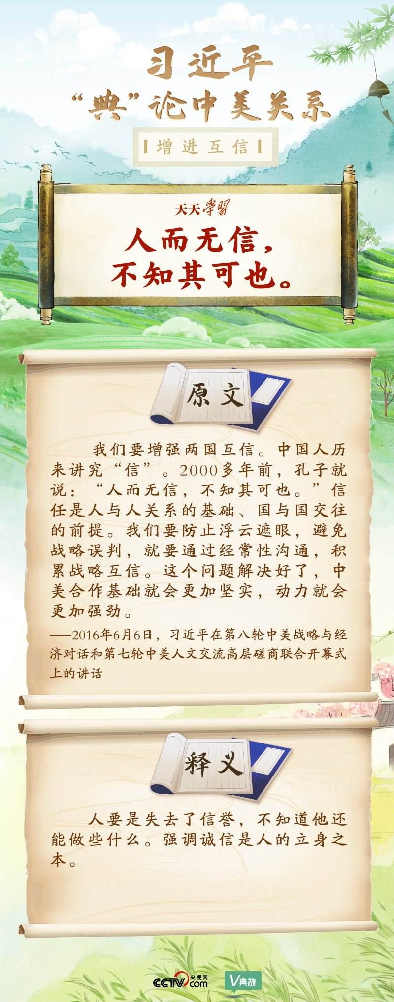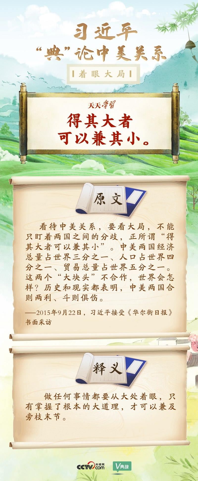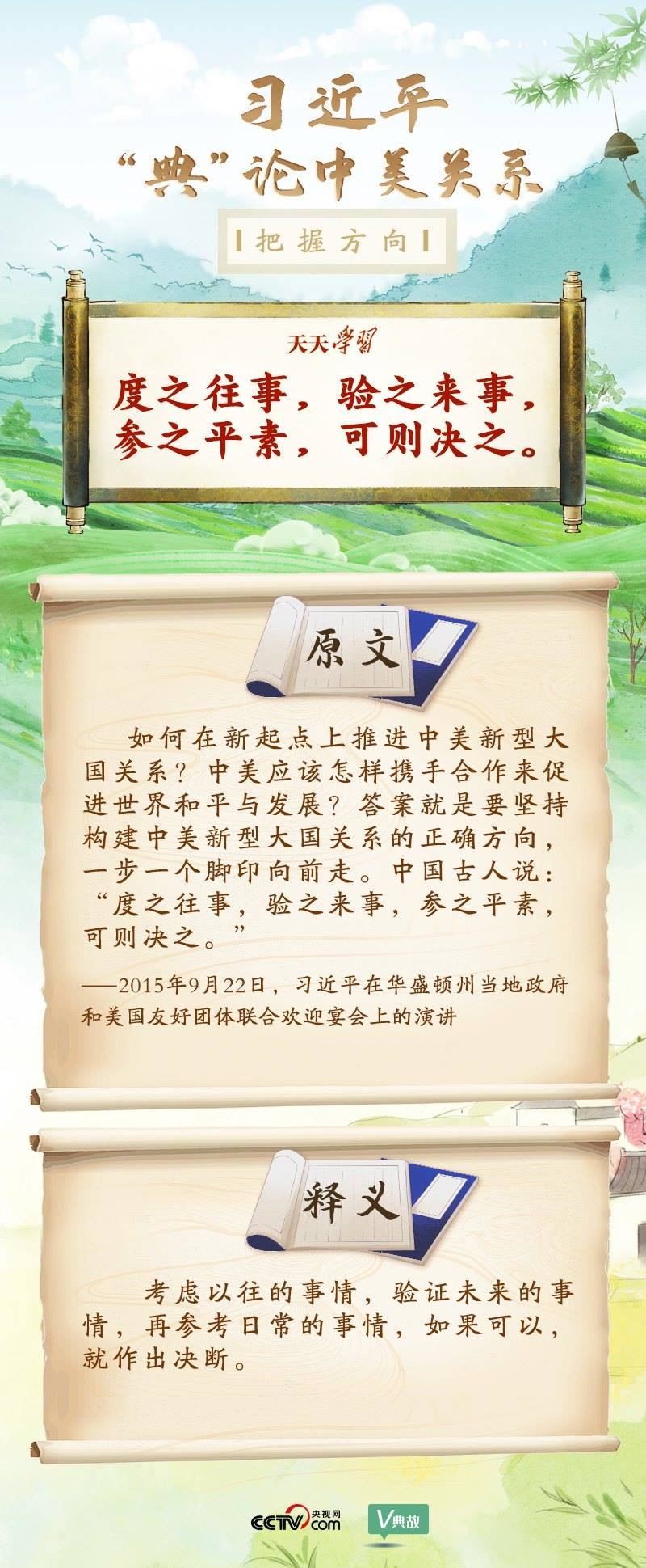 黨的十八大以來,習近平主席就中美關(guān)系發(fā)表了一系列重要講話。他站在時代高度分析、研判中美關(guān)系現(xiàn)狀及發(fā)展趨勢,并引經(jīng)據(jù)典為發(fā)展中美關(guān)系指出正確方向。這些論述蘊含深刻的戰(zhàn)略思維和政治智慧,具有重大現(xiàn)實意義和深遠歷史意義。央視網(wǎng)《天天學習》與您一起深刻領(lǐng)會。