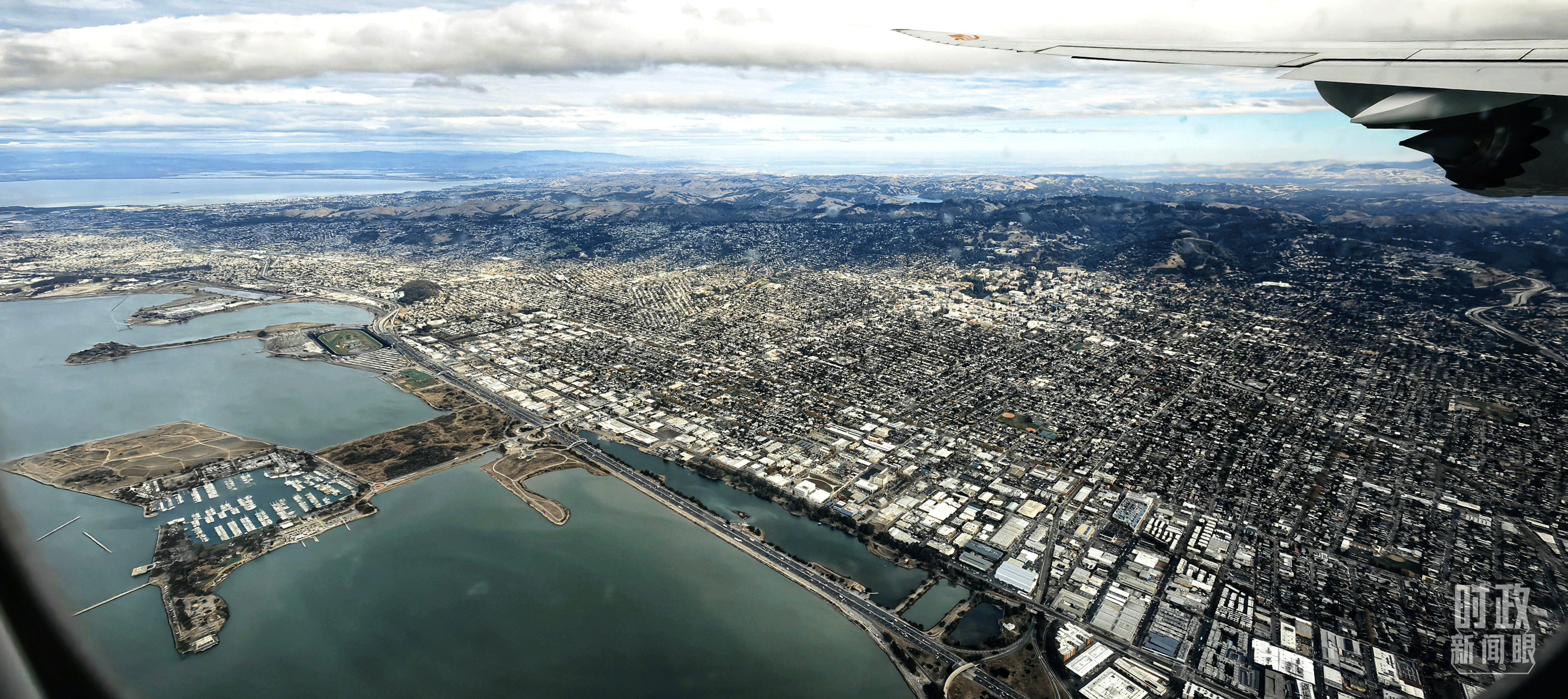 △習(xí)近平乘坐的專機(jī)即將降落舊金山國(guó)際機(jī)場(chǎng)。(總臺(tái)央視記者張曉鵬拍攝)