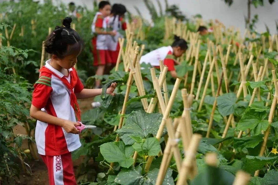 △今年6月,育英學(xué)校小農(nóng)場(chǎng)迎來豐收,同學(xué)們?cè)诓烧卟恕?/span>