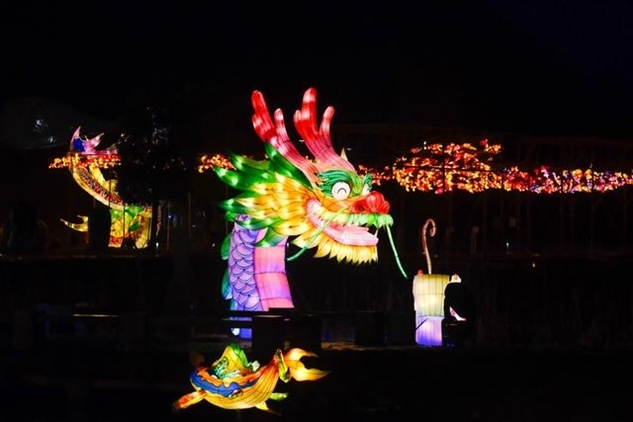 同樣迎來2024年龍年新春燈會的,還有湖北省恩施州宣恩縣城,這里的龍造型燈組格外亮眼,特別是其中一條非常壯觀的“貢水游龍”,龍身由30多只竹筏串聯(lián)而成,總長度達到200多米。游客還可以登上龍船觀燈展、賞夜色。隨著金色的巨龍在碧水中蜿蜒游動,也傳遞著吉祥的寓意。