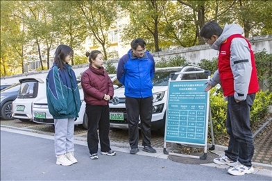 △ 2023年12月1日,工作人員在江蘇省泰州市蘇源花園二期居民區(qū)給車主講解執(zhí)行居民電價(jià)相關(guān)優(yōu)惠政策。