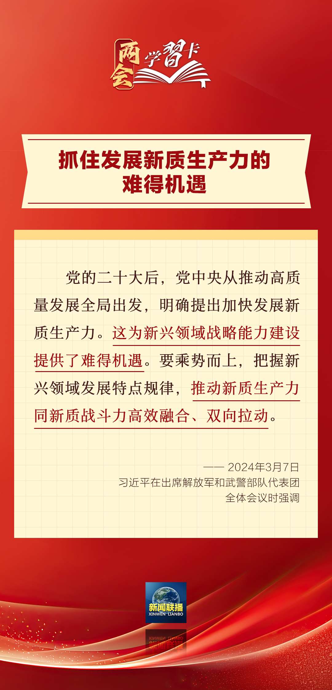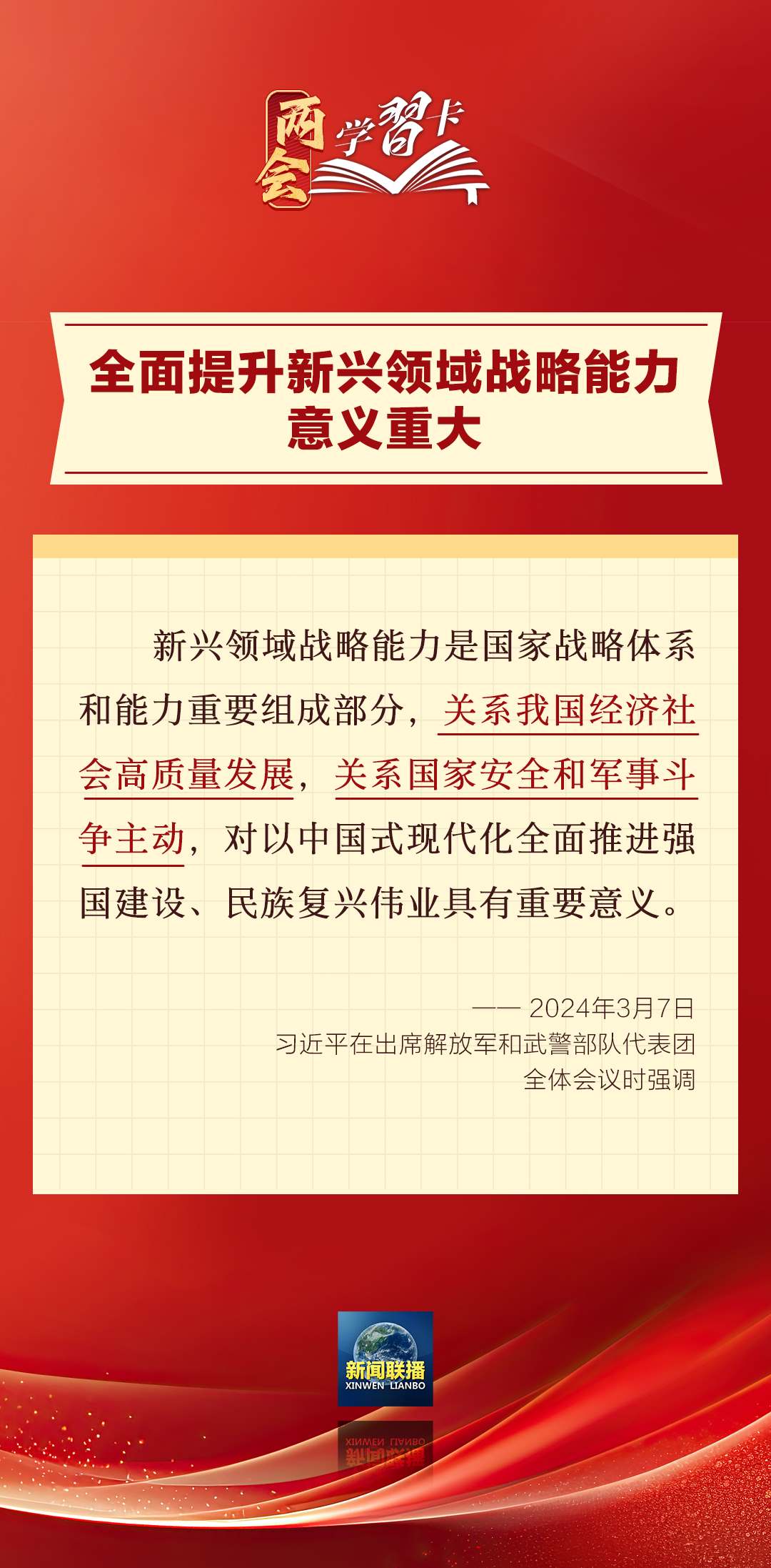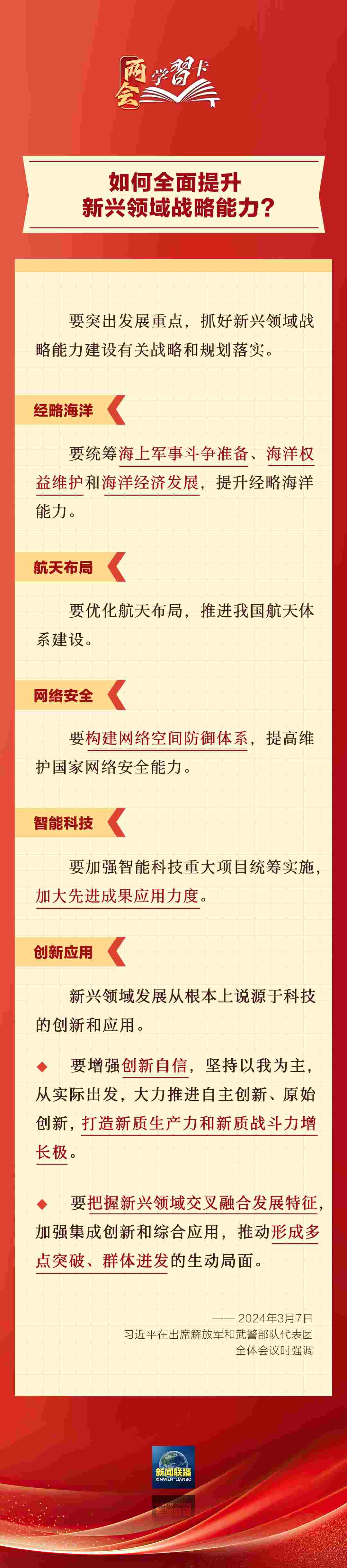 3月7日,習(xí)近平在出席解放軍和武警部隊(duì)代表團(tuán)全體會議時強(qiáng)調(diào),強(qiáng)化使命擔(dān)當(dāng),深化改革創(chuàng)新,全面提升新興領(lǐng)域戰(zhàn)略能力。如何提升新興領(lǐng)域戰(zhàn)略能力?一起學(xué)習(xí)↓↓↓
