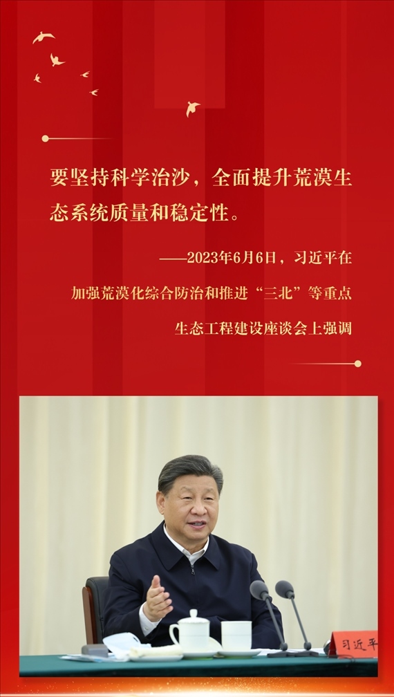 2023年6月5日至6日,習(xí)近平在內(nèi)蒙古巴彥淖爾考察,并主持召開加強(qiáng)荒漠化綜合防治和推進(jìn)“三北”等重點(diǎn)生態(tài)工程建設(shè)座談會(huì)。這是6日上午,習(xí)近平在臨河區(qū)國營新華林場考察。