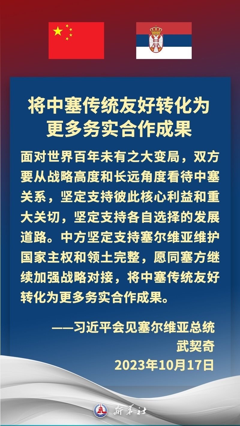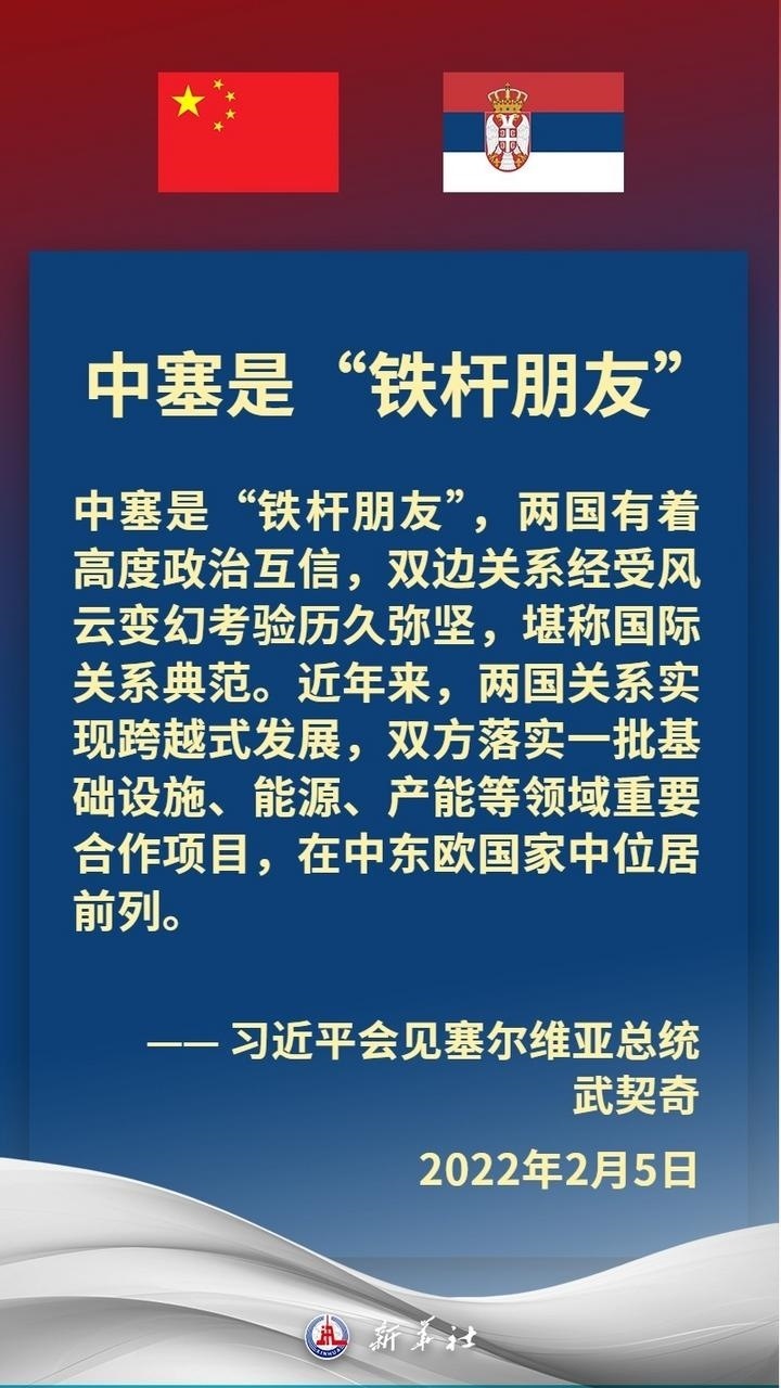 塞爾維亞是中國(guó)在中東歐地區(qū)首個(gè)全面戰(zhàn)略伙伴。近年來(lái),在習(xí)近平主席和武契奇總統(tǒng)戰(zhàn)略引領(lǐng)下,中塞關(guān)系保持高水平運(yùn)行,雙方堅(jiān)定支持彼此核心利益和重大關(guān)切,兩國(guó)政治互信牢固,高質(zhì)量共建“一帶一路”取得豐碩成果,在多邊領(lǐng)域協(xié)調(diào)緊密。習(xí)近平主席多次在重要場(chǎng)合提及,中國(guó)和塞爾維亞是“鐵桿朋友”。