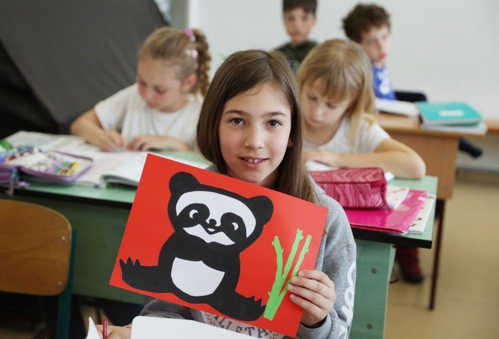 △2024年5月3日,匈中雙語學校三年級學生寶怡展示自己的大熊貓形象美術作品。