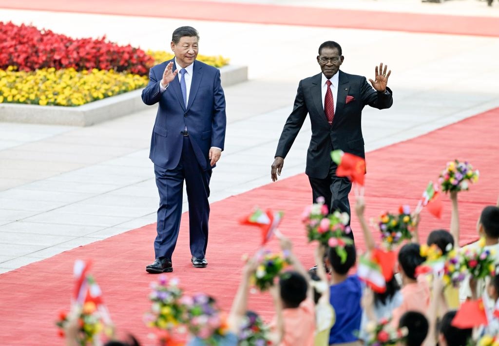 ??5月28日下午,國家主席習近平在北京人民大會堂同來華進行國事訪問的赤道幾內(nèi)亞總統(tǒng)奧比昂舉行會談。這是會談前,習近平在人民大會堂東門外廣場為奧比昂舉行歡迎儀式。新華社記者 殷博古 攝