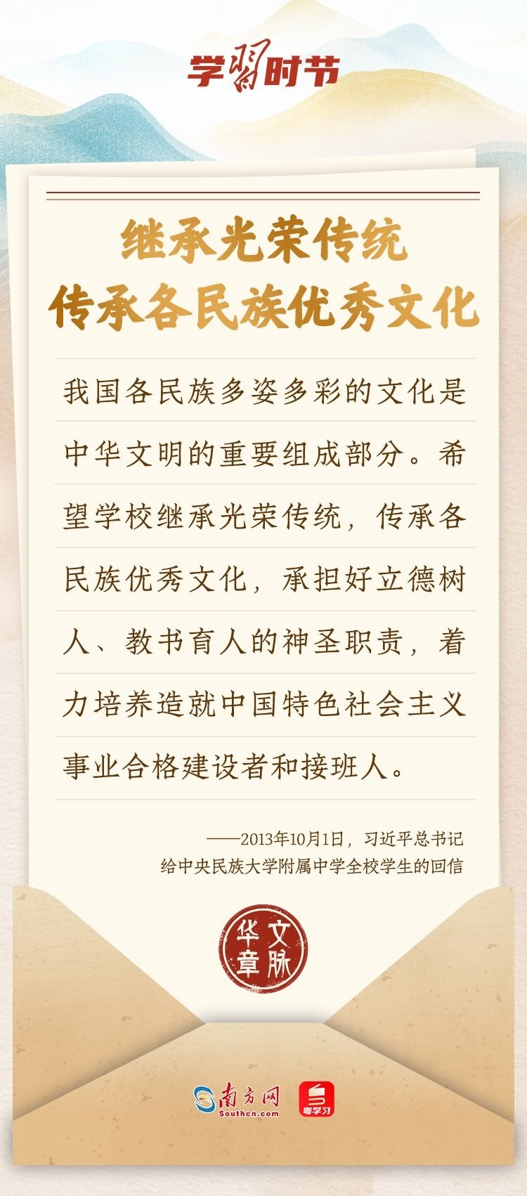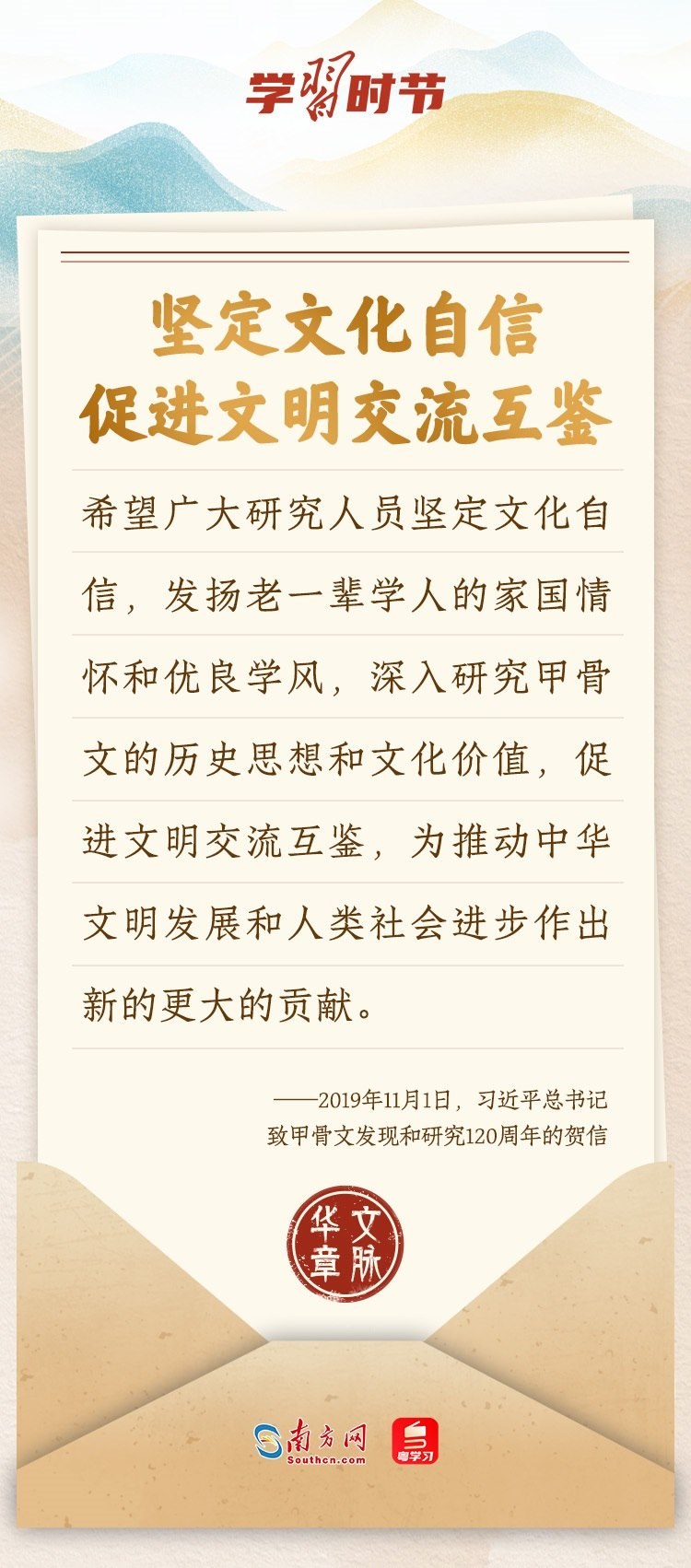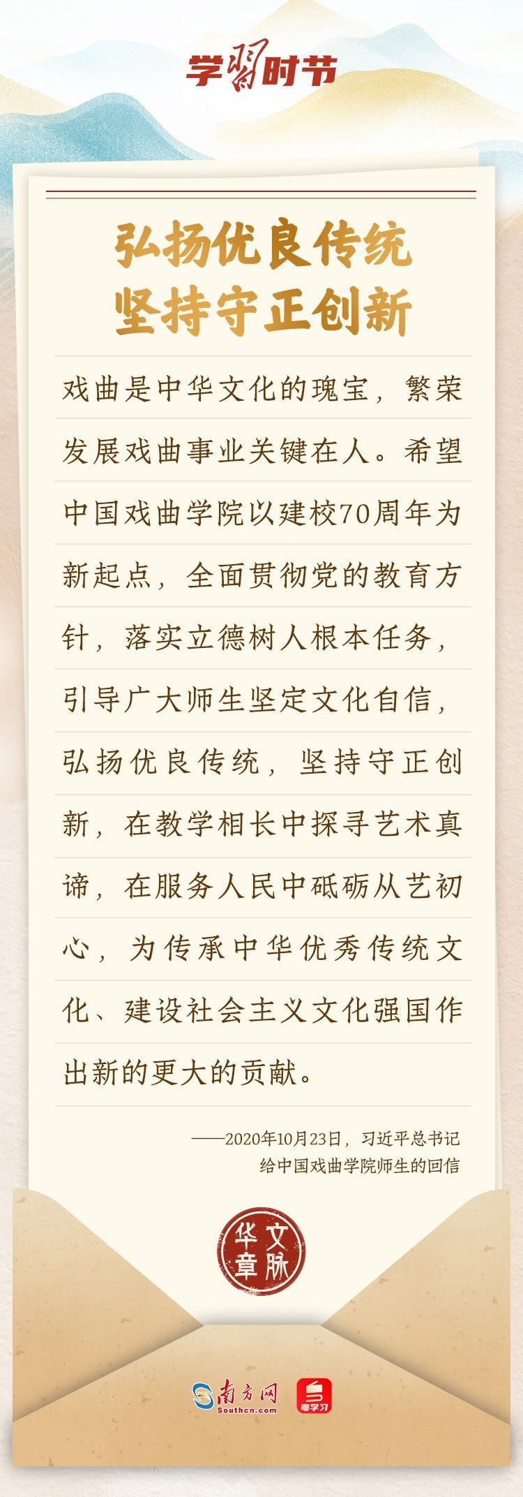 “中華民族在幾千年歷史中創(chuàng)造和延續(xù)的中華優(yōu)秀傳統(tǒng)文化,是中華民族的根和魂?!绷暯娇倳浂啻瓮ㄟ^發(fā)賀信、寫回信等方式,表達著對弘揚中華優(yōu)秀傳統(tǒng)文化的殷切希望,飽含深情、字字暖心、催人奮進。讓我們一起“讀”信。