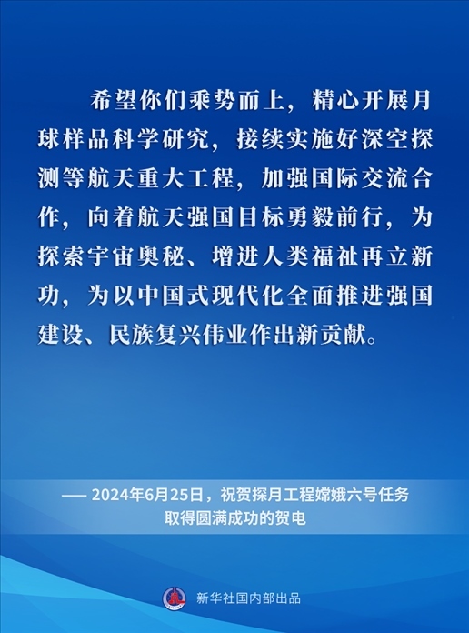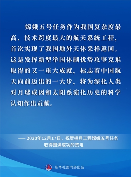 黨的十八大以來,在以習(xí)近平同志為核心的黨中央關(guān)心引領(lǐng)下,中國探月工程取得舉世矚目的重大成就,為探索宇宙奧秘、增進(jìn)人類福祉屢立新功,為以中國式現(xiàn)代化全面推進(jìn)強(qiáng)國建設(shè)、民族復(fù)興偉業(yè)作出卓越貢獻(xiàn)。
