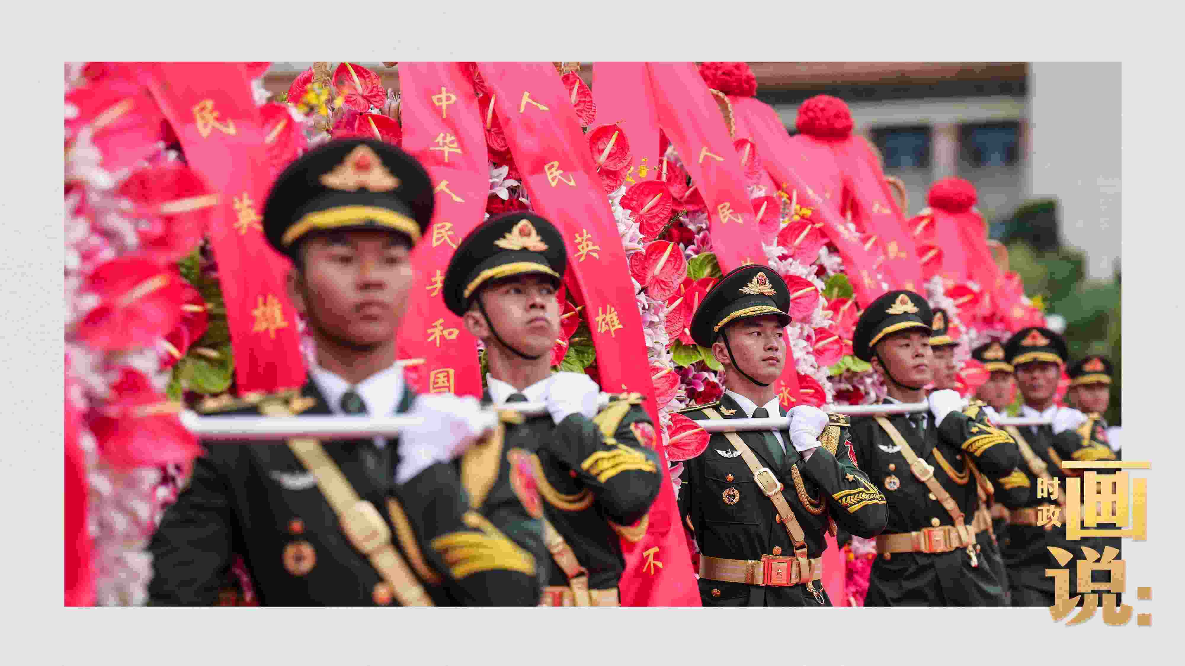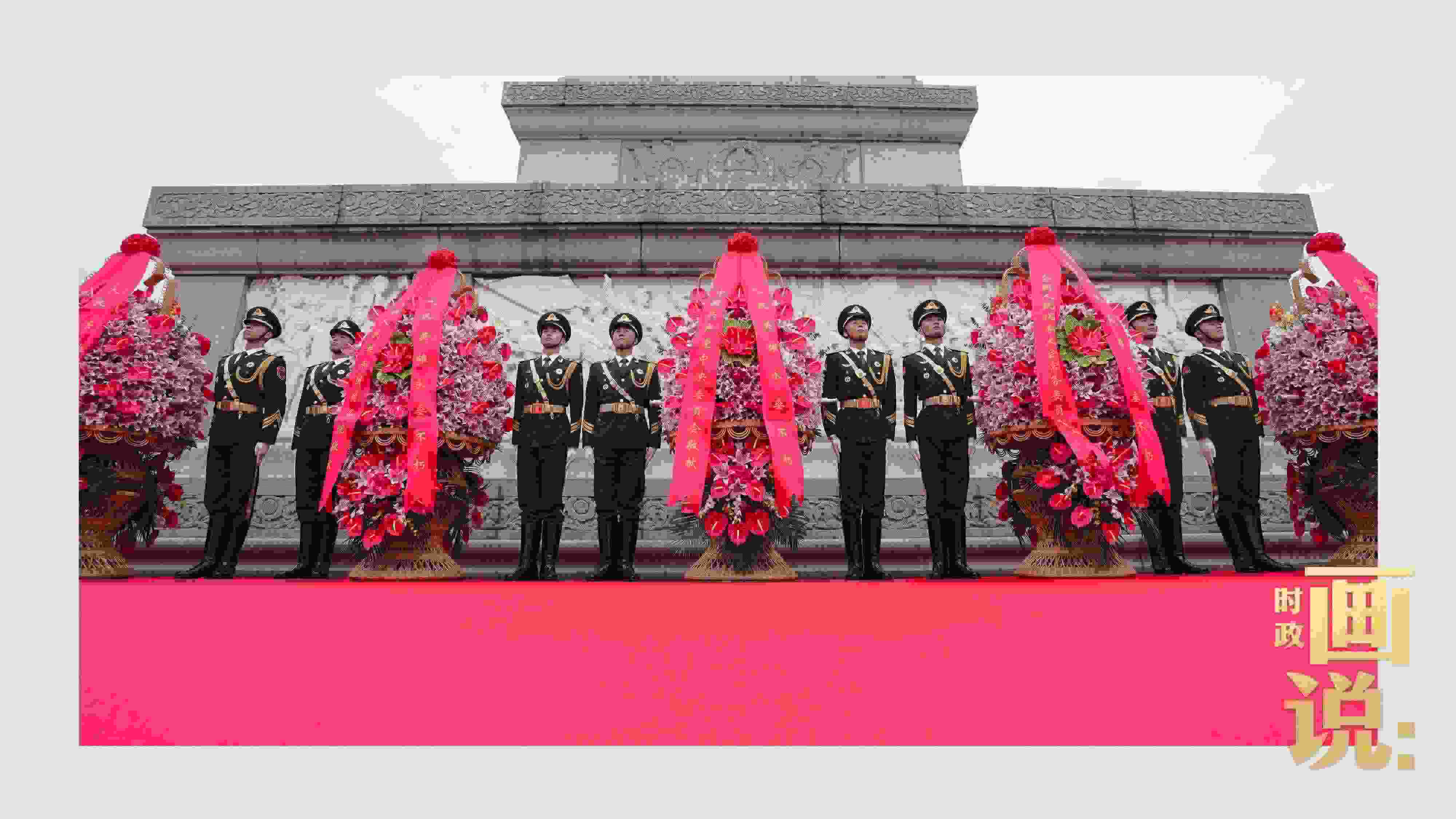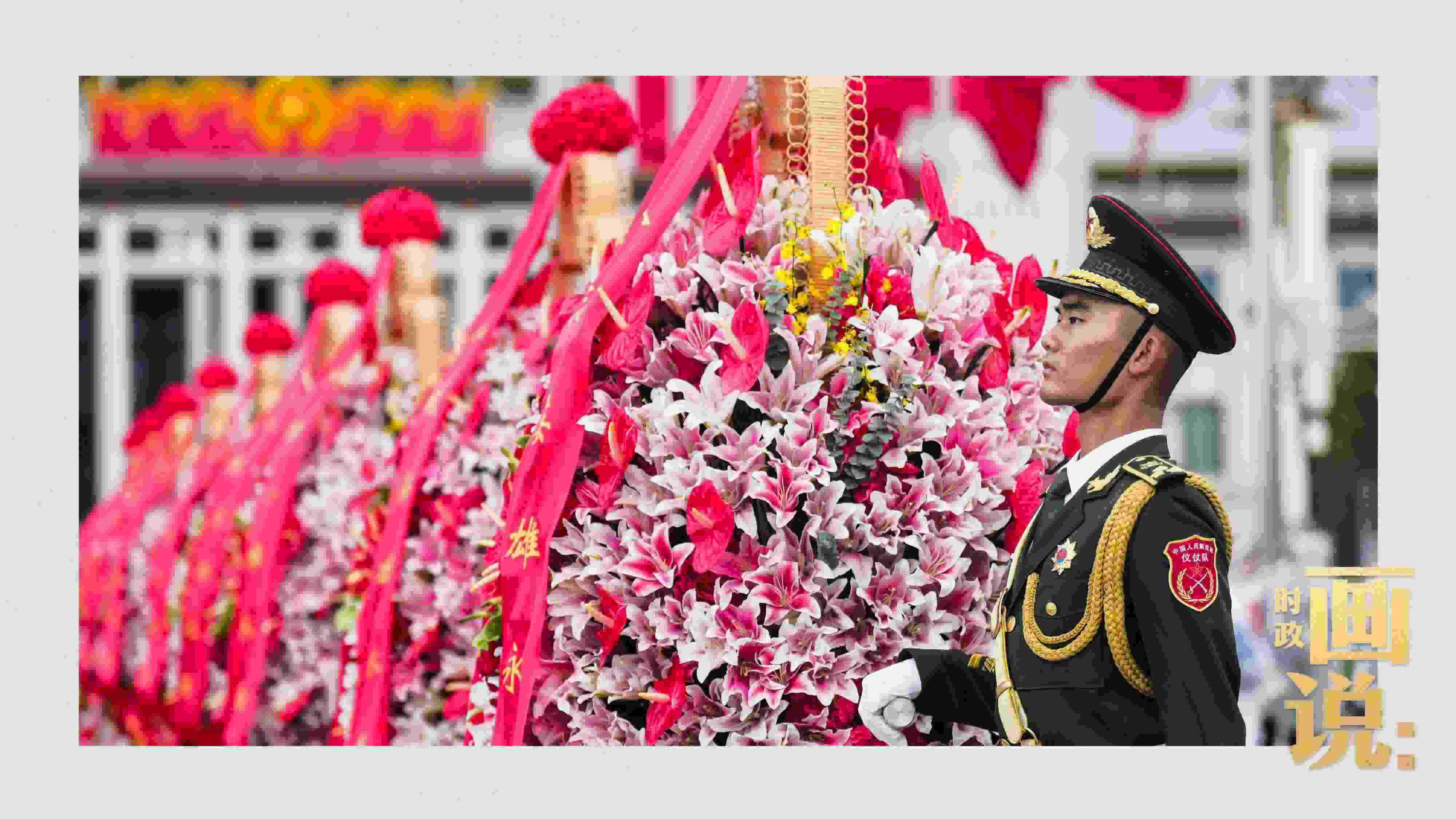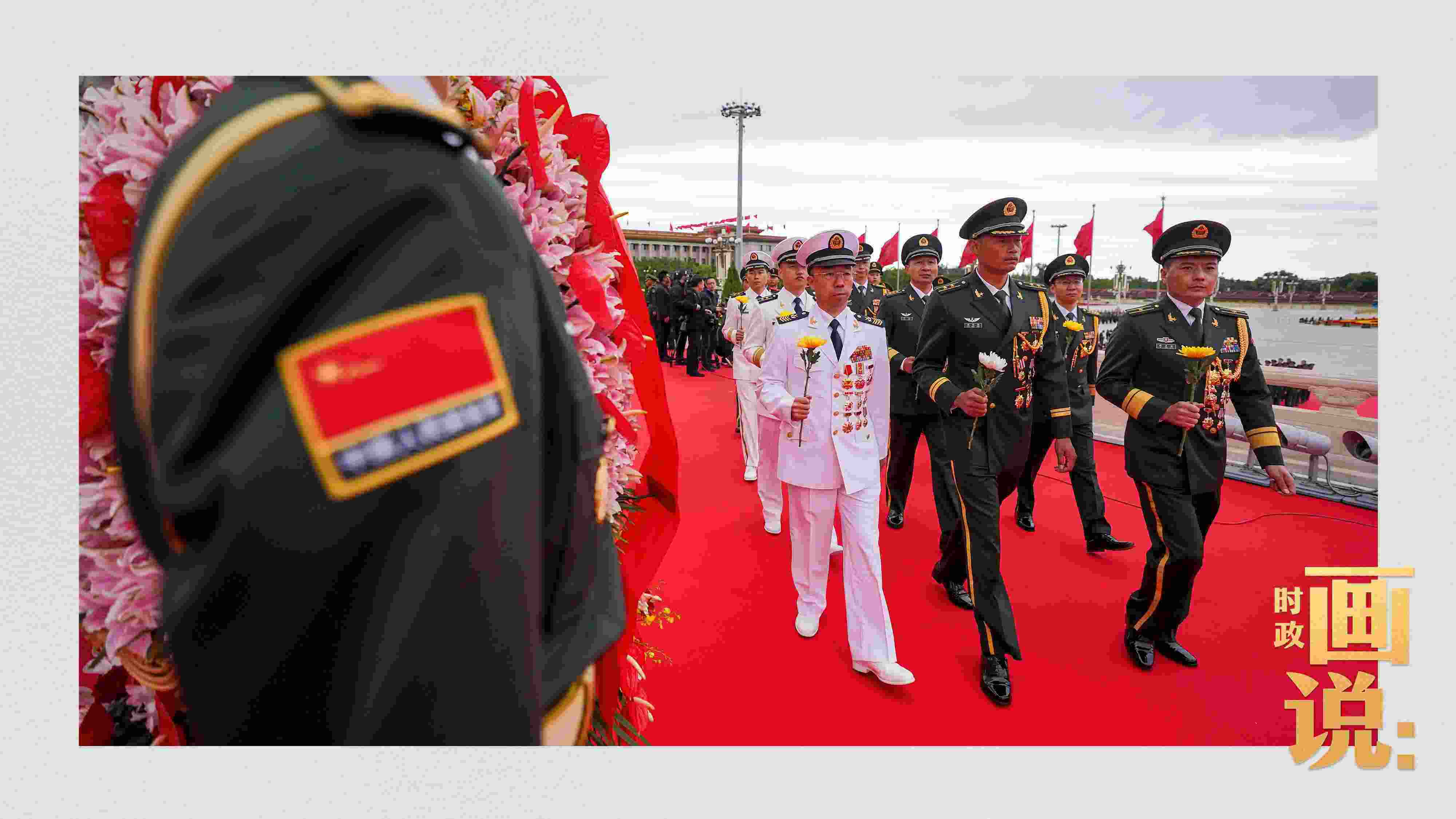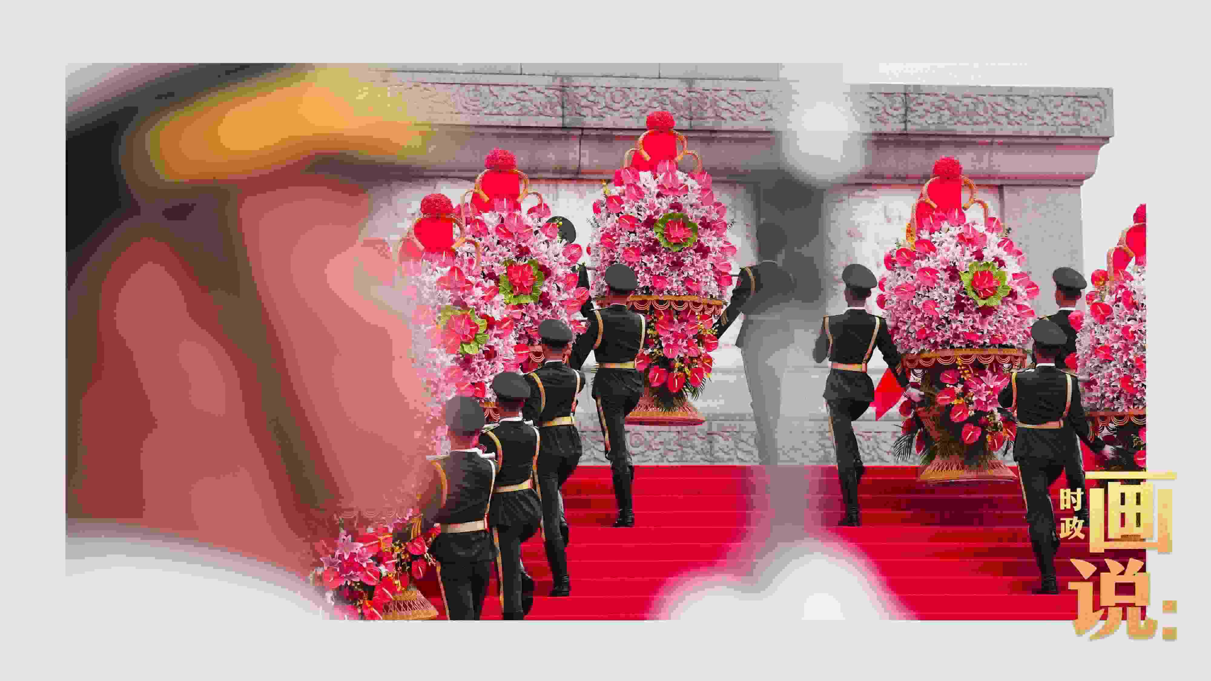 △禮兵抬起花籃,緩步走向人民英雄紀(jì)念碑。