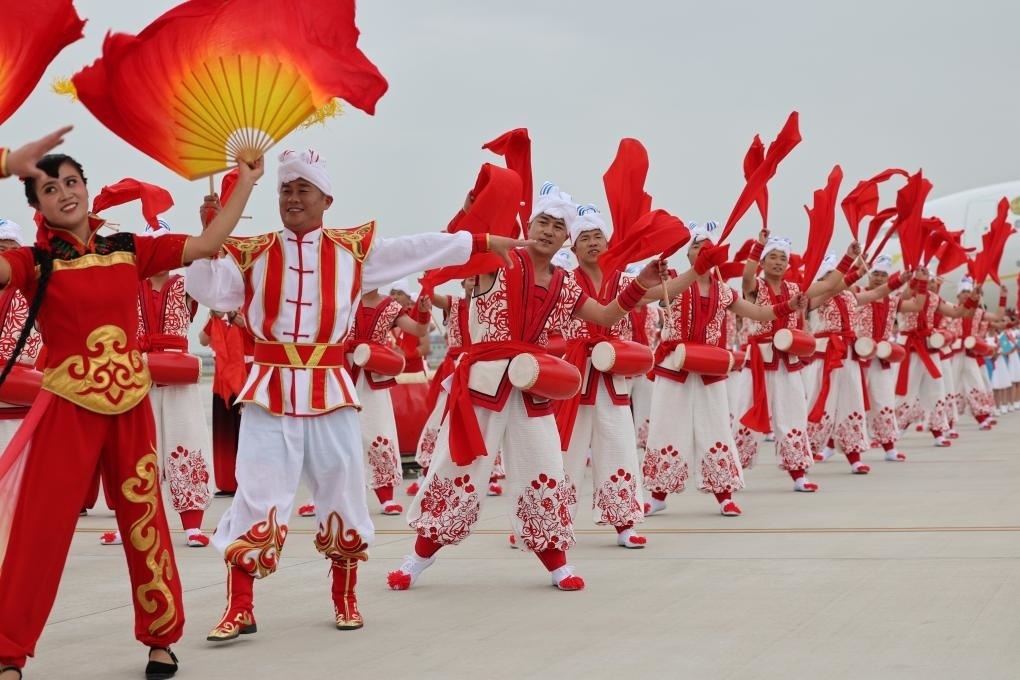 2023年5月17日下午,出席中國-中亞峰會的哈薩克斯坦總統(tǒng)托卡耶夫抵達(dá)陜西省西安市。當(dāng)?shù)孛癖娨詿崆榈难摹g快的秧歌等民間藝術(shù)表演歡迎貴賓到來。新華社記者 邢廣利 攝