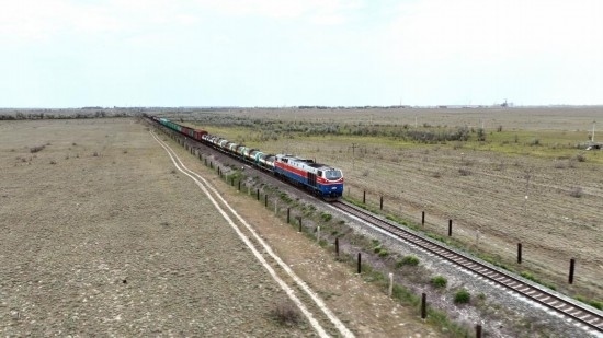 2023年5月12日,在哈薩克斯坦阿拉木圖附近,貨運列車馳騁于阿拉木圖與中國霍爾果斯間(無人機照片)。新華社發(fā)(奧斯帕諾夫攝)