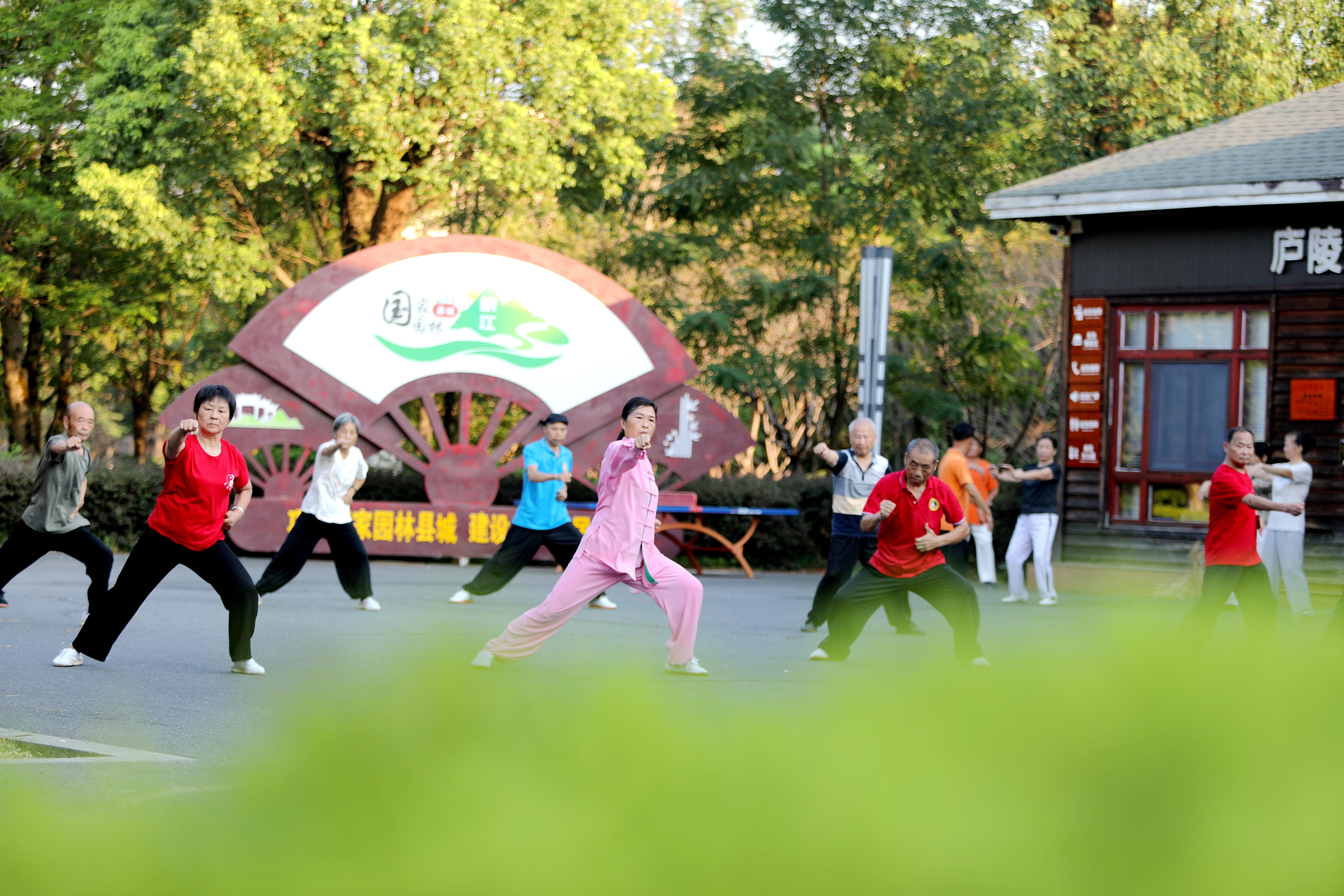 △2024年7月24日,江西省吉安市峽江縣水邊鎮(zhèn)一濕地公園休閑廣場,老年人在打太極。