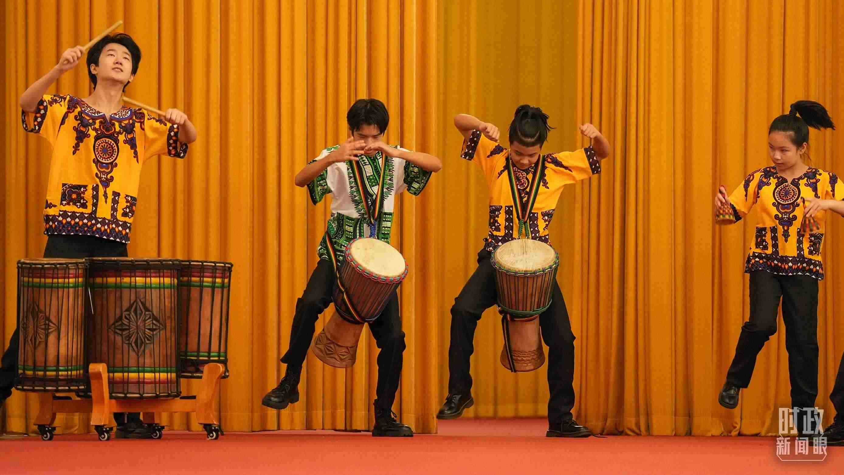 △中國少年打起歡快的非洲鼓。(總臺(tái)記者李晉拍攝)