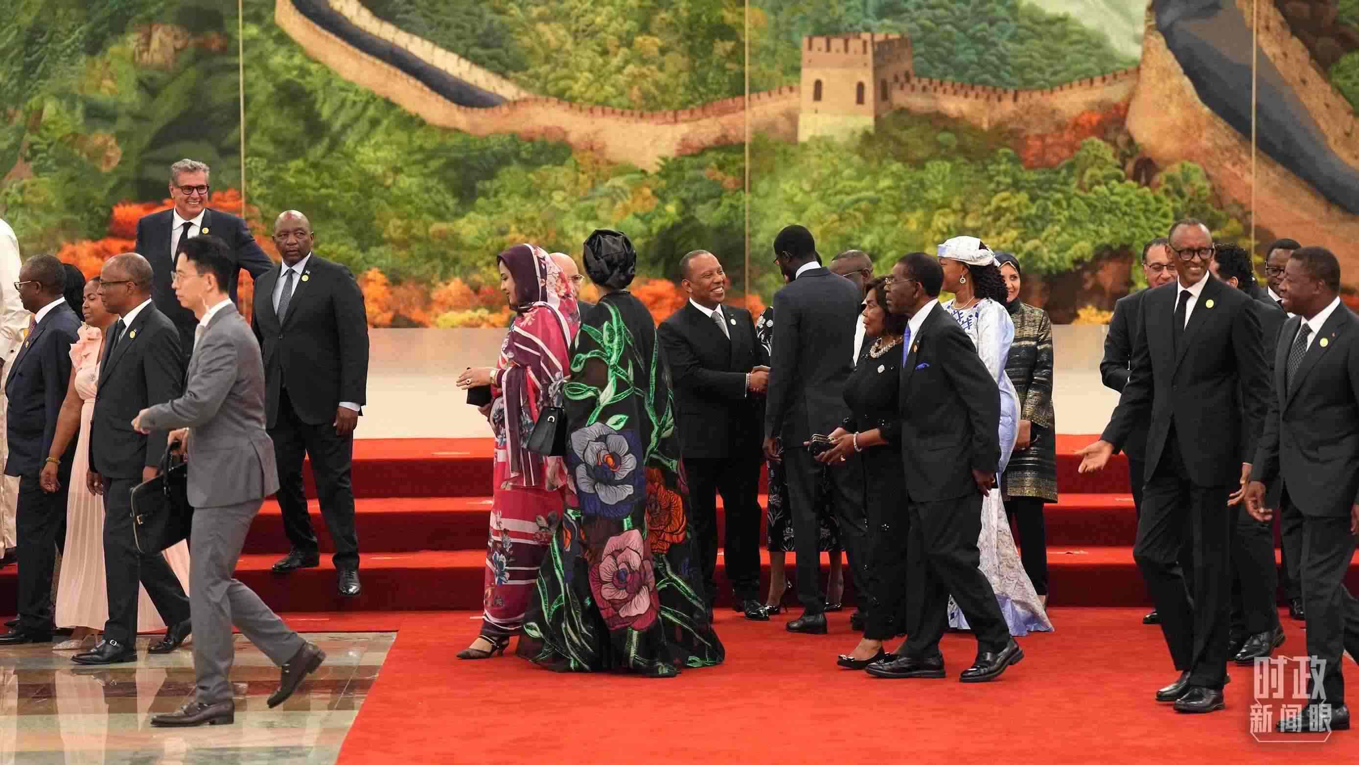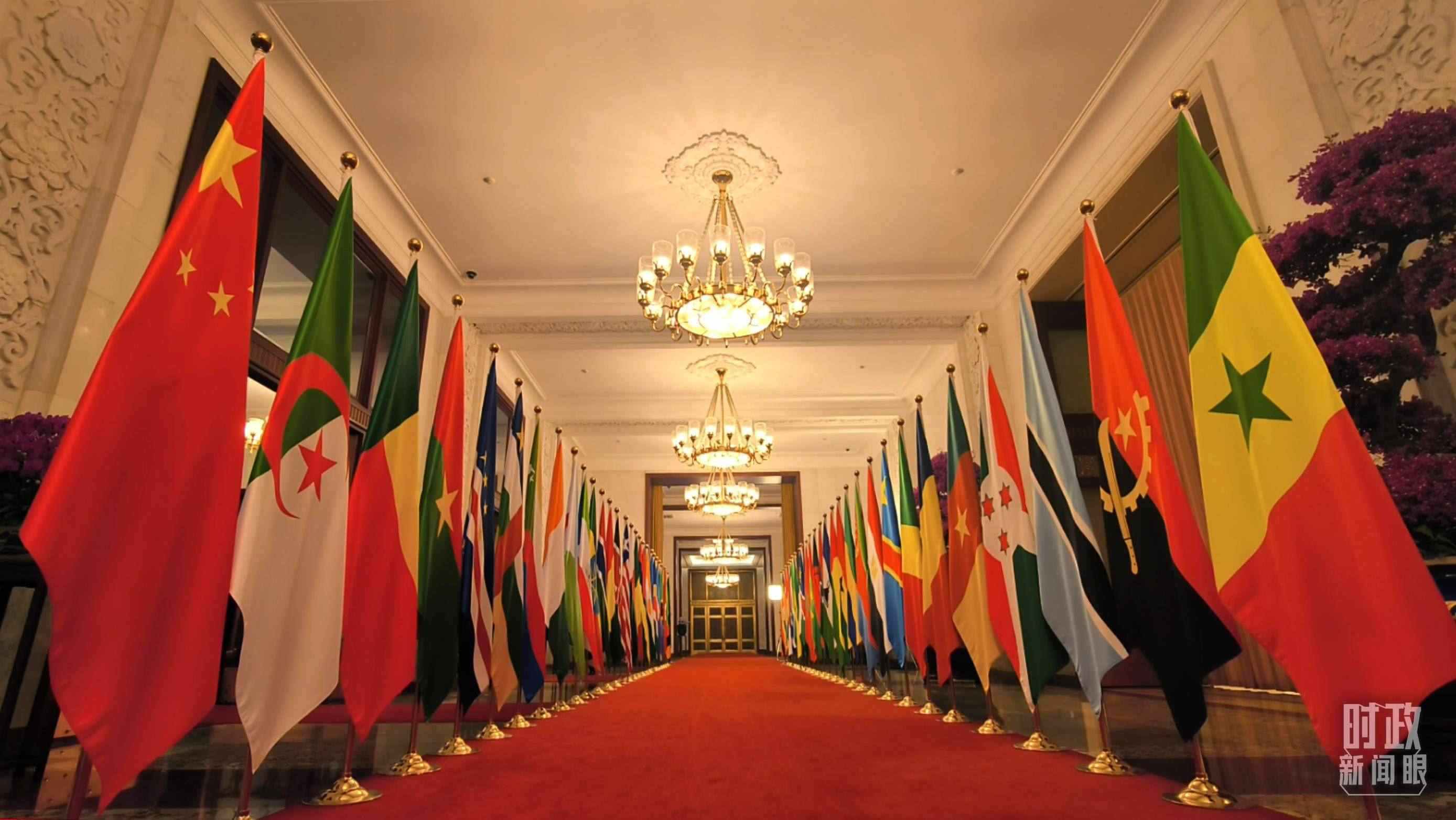 人民大會(huì)堂北大廳,中國國旗和中非合作論壇成員國國旗以及非洲聯(lián)盟旗幟交相輝映,巨幅蘇繡壁畫《長(zhǎng)城》氣勢(shì)恢宏。