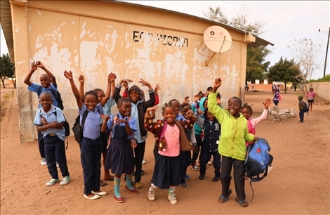 △2023年7月25日,莫桑比克馬普托省皮科科村學(xué)校的孩子們站在裝有中國援助的衛(wèi)星電視接收天線的房屋前。