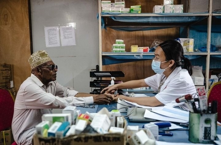 2024年1月11日,中國第15批援科摩羅醫(yī)療隊(duì)隊(duì)長(zhǎng)潘春熹在位于科摩羅首都莫羅尼的馬魯夫醫(yī)院內(nèi)為患者看病。新華社記者 王冠森 攝