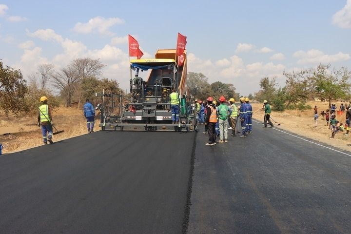 2024年8月27日,在馬拉維恩科塔科塔,施工人員在卡帕滕加至本加公路升級(jí)改造項(xiàng)目路段鋪筑瀝青路面。新華社發(fā)