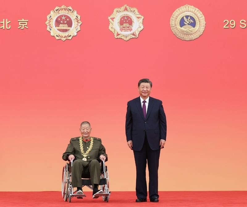 △2024年9月29日,國(guó)家勛章和國(guó)家榮譽(yù)稱(chēng)號(hào)頒授儀式上,習(xí)近平總書(shū)記向“共和國(guó)勛章”獲得者黃宗德頒授勛章后合影。