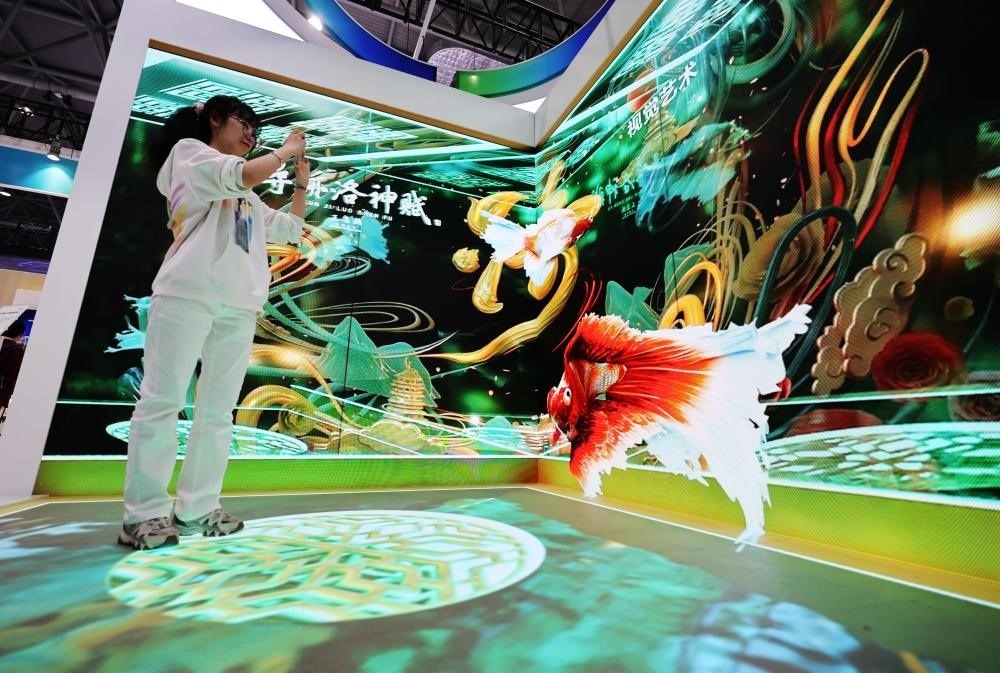 2024年4月1日,在安徽合肥舉辦的2024國際顯示技術大會上,一名觀眾體驗京東方展出的裸眼3D快速拆裝折角屏。